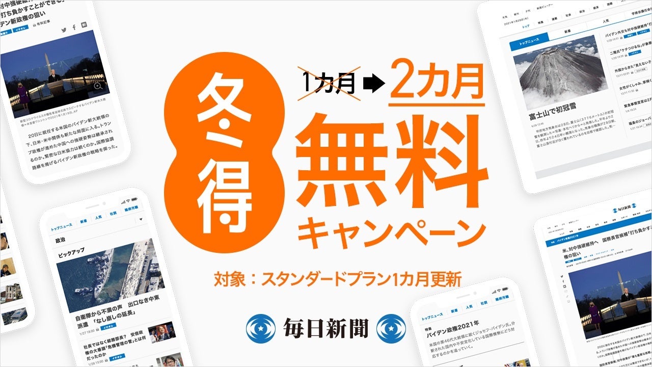 スタンダードプランが2カ月無料!毎日新聞デジタル『冬得』キャンペーン 好評につき2月3日まで延長!!