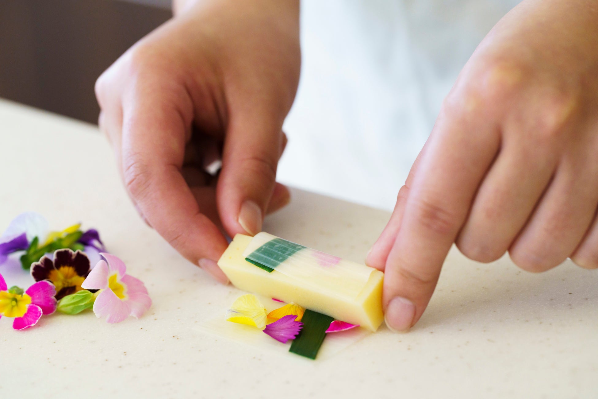 海風が抜ける施設内のキッチンスタジオ「ゆがふキッチン」で、星のや沖縄のシェフとともに琉球王朝時代の宮廷料理「東道盆」を作ります。「東道盆」は、琉球漆器の代表的な器で、器そのものと盛り付けられた料理も含めて「東道盆」と呼ばれます。盛り付ける7品の料理の中から、はなやかな彩りが印象的な「花イカ」、「ヒラガラマチ」の2品を作るプログラムです。またハーブが旬を迎える春から夏にかけては王家のお祝いごとや、法事などの特別な行事に用いられてきた繊細な琉球菓子「花ぼうる」を作り、秋から冬にかけては色鮮やかな野菜をだし汁で食す伝統料理「セーファン」作りにも挑戦します。畑や庭で採れた彩り豊かな食材をふんだんに盛り付けて、テーブルを華やかに彩ります。