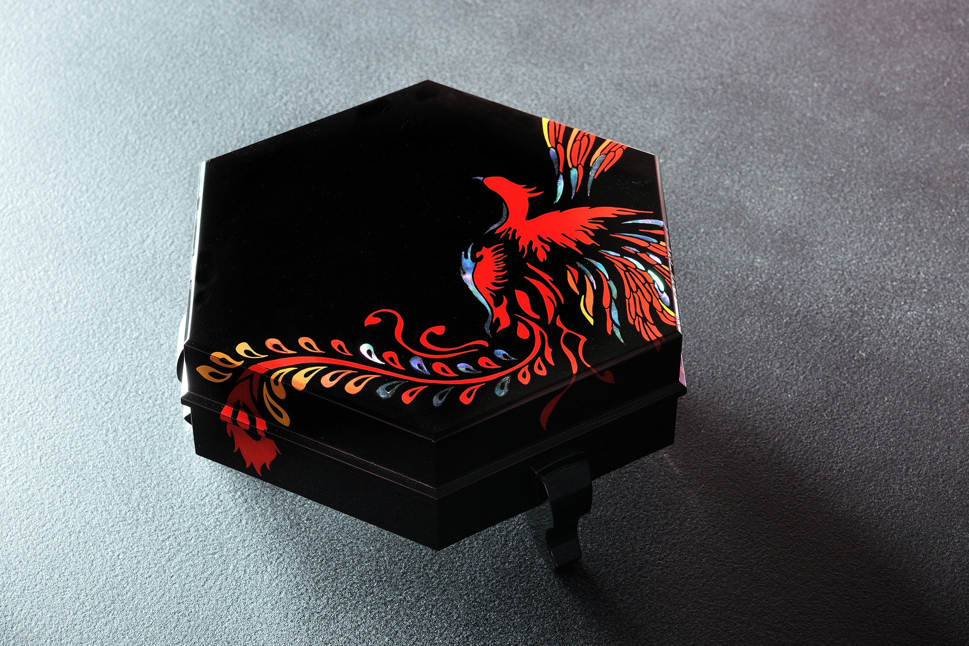 「東道盆」に使用した琉球漆器は、宮廷舞踊や冊封使のための重要な器とされ、江戸時代には将軍家への献上器、諸大名への贈答品としても喜ばれていました。艶やかに輝く漆に、虹色の光沢を持つ夜光貝やアワビ貝の「螺鈿細工(らでん)」や、金箔の「沈金(ちんきん)」、「箔絵(はくえ)」、「堆錦(ついきん)」など、琉球漆器独自の技法が施されています。琉球王朝時代から続く職人の技術が詰まった貴重な漆器を手に取りながら、料理とともに美しい器を楽しみます。