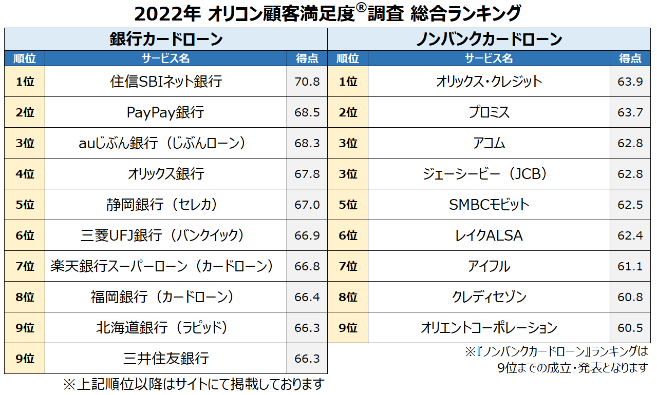 満足度の高い『銀行カードローン』『ノンバンクカードローン』ランキング発表(オリコン顧客満足度調査)