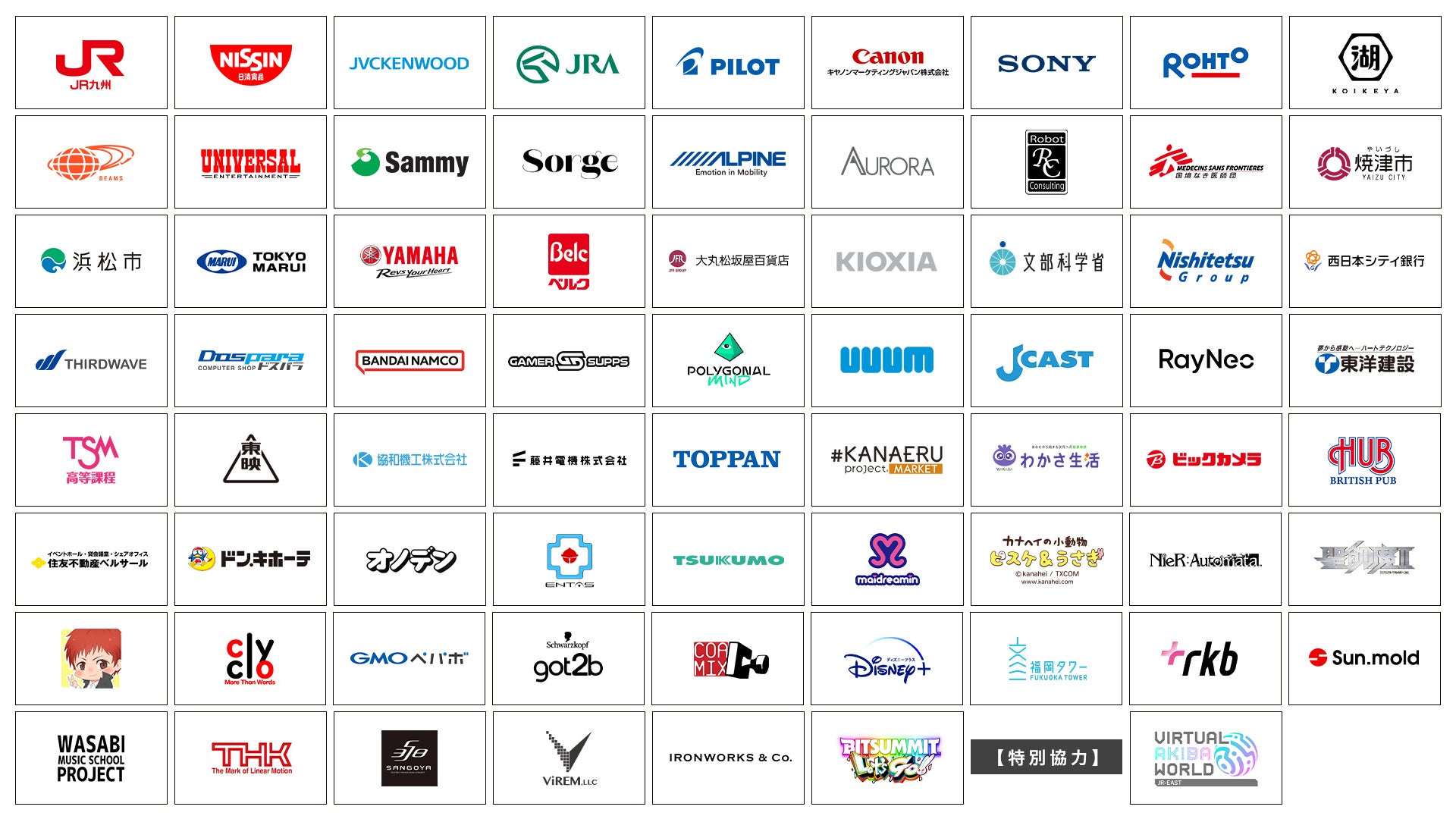 九州旅客鉄道株式会社/日清食品株式会社/株式会社JVCケンウッド/日本中央競馬会(JRA)/株式会社パイロットコーポレーション/キヤノンマーケティングジャパン株式会社/ソニー株式会社/ロート製薬株式会社/株式会社湖池屋/株式会社ビームス/株式会社ユニバーサルエンターテインメント/サミー株式会社/Sorge/アルパインマーケティング株式会社/オーロラ株式会社/株式会社Robot Consulting/特定非営利活動法人 国境なき医師団日本/静岡県焼津市/静岡県浜松市/株式会社東京マルイ/ヤマハ発動機株式会社/株式会社ベルク/株式会社大丸松坂屋百貨店/キオクシア株式会社/文部科学省/西日本鉄道株式会社/株式会社西日本シティ銀行/株式会社サードウェーブ/ドスパラ/バンダイナムコミュージックライブ/ゲーマーサップス(Gamer Supps®)/ポリゴナルマインド/UUUM/株式会社ジェイ・キャスト/TCL RayNeo/東洋建設株式会社/SO.ON project LaV 東京スクールオブミュージック&ダンス専門学校/東映株式会社/協和機工株式会社/藤井電機株式会社/凸版印刷株式会社/かなプロマーケット/株式会社わかさ生活/株式会社ビックカメラ/株式会社ハブ/住友不動産ベルサール株式会社/株式会社パン・パシフィック・インターナショナルホールディングス/株式会社オノデン/秋葉原エンタス/TSUKUMO/めいどりーみん/カナヘイの小動物/NieR:Automata/聖飢魔Ⅱ/赤髮のとも/合同会社クリクロ/GMOペパボ株式会社/Schwarzkopf got2b/コアミックス/ディズニープラス/福岡タワー/RKB毎日放送株式会社/日本サンモルド株式会社/山葵音楽学校プロジェクト/THK株式会社/株式会社三五屋/合同会社ViREM/有限会社アイアンワークス/BitSummit