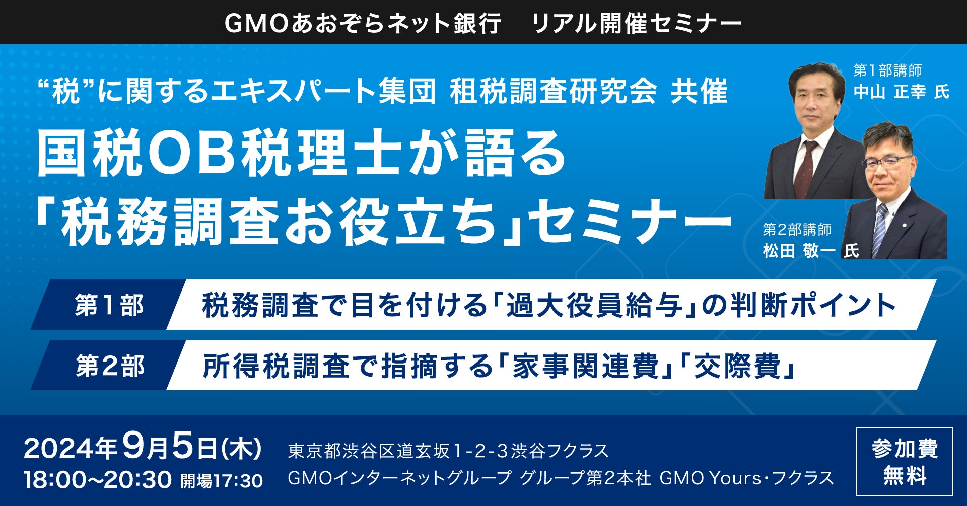GMOあおぞらネット銀行株式会社(以下、当社)は、2024年9月5日(木)18:00より、一般社団法人租税調査研究会に所属されている国税OB税理士の先生をお迎えし、税務調査に役立つ情報が満載のセミナーを開催いたします。