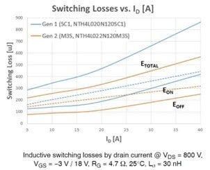 オンセミは、第1世代の1200 V EliteSiC M1 MOSFET(NTH4L020N120SC1)が市場で成功を収めた後、スイッチング性能の最適化に重点を置いた第2世代の1200 V EliteSiC M3 MOSFET(NTH4L022N120M3S)を発表しました。スイッチング損失は、システム効率における重要なパラメータであり、図1が示すようにM3Sは与えられた条件下でスイッチング性能を大幅に向上させており、M1に比べてEOFFで40%、EONで20~30%低く、全スイッチング損失は34%減少しています。また、高スイッチング周波数アプリケーションでは、RDS(ON)温度係数が高い短所を相殺することができます。