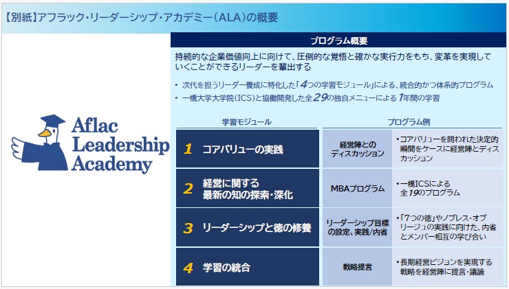 アフラック生命保険株式会社(代表取締役社長:古出 眞敏)は、当社の次代の経営を担う人財のリーダーシップ開発に特化した、企業内大学「アフラック・リーダーシップ・アカデミー(以下「ALA」)」を開校しましたので、お知らせします。