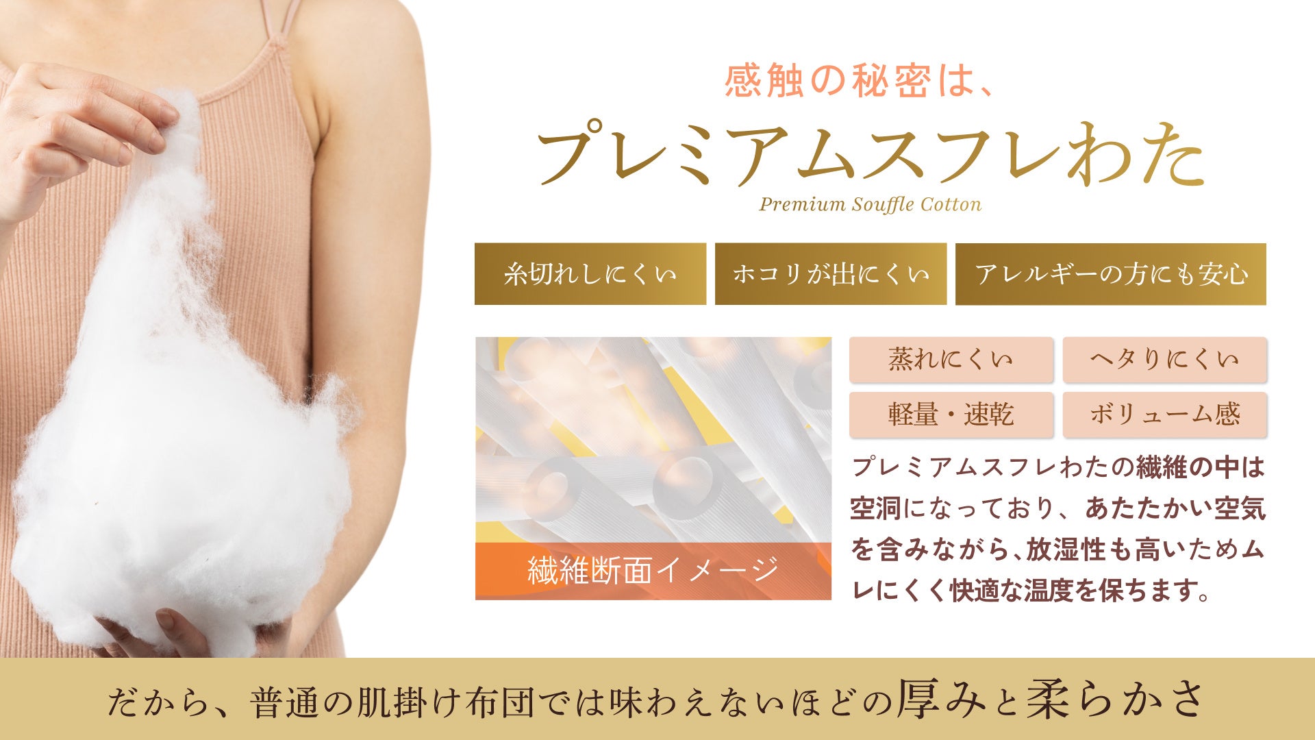 空気をたっぷり含む「プレミアムスフレわた」が、ふわっともちっとした弾力で身体を包み込みます。