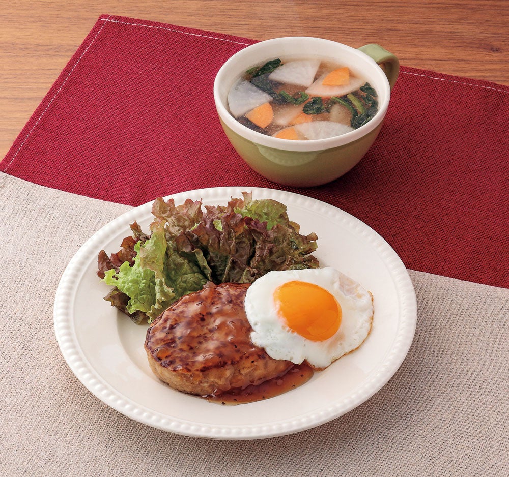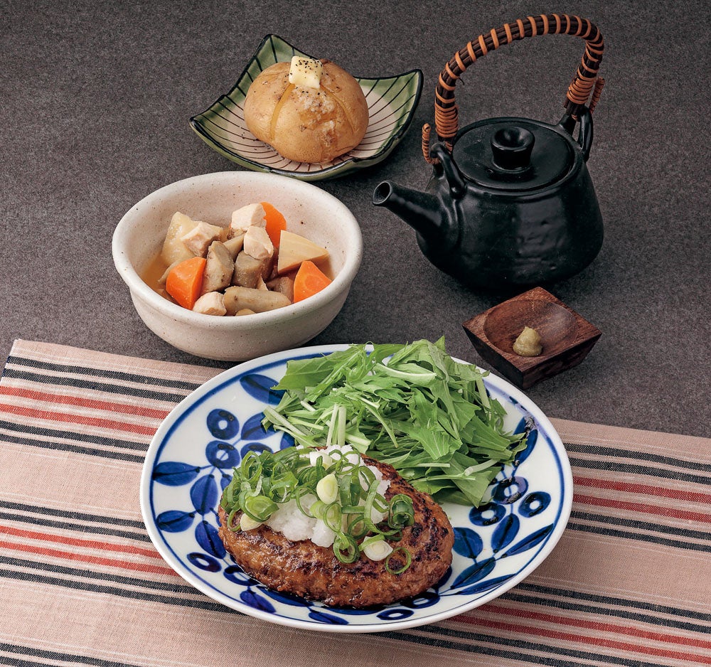 十六種雑穀米を加えた照り焼きハンバーグに、大根おろし、わけぎをのせてさっぱりと食べられます。だしをかければ、一度で二度美味しい♪