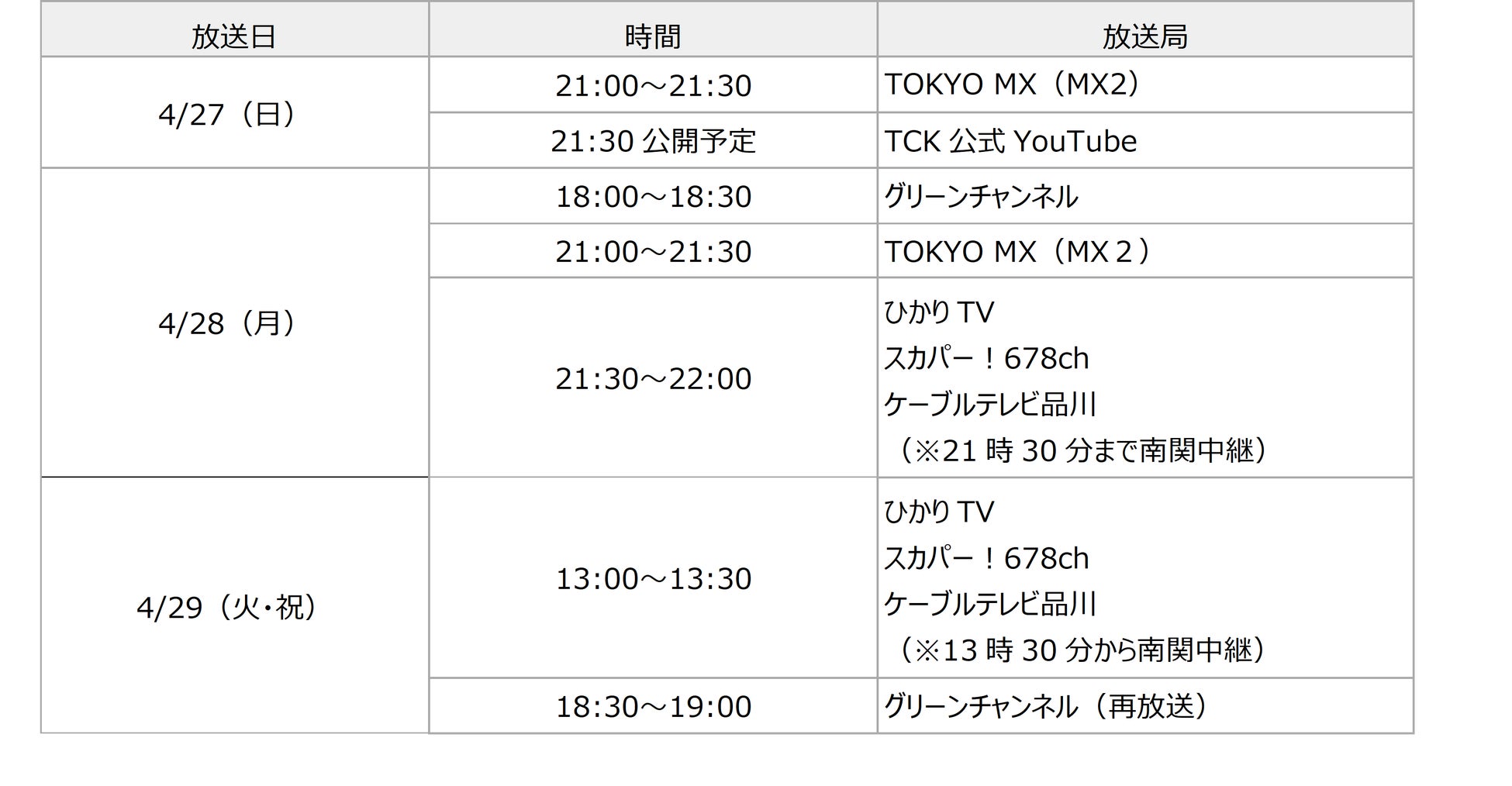 本番組は、4月27日(日)のTOKYO MX(MX2)を皮切りに羽田盃当日(4/29)までスカパー!678chやグリーンチャンネルなどで放送されるほか、TCK公式YouTubeでも公開からいつでもご覧いただけます。