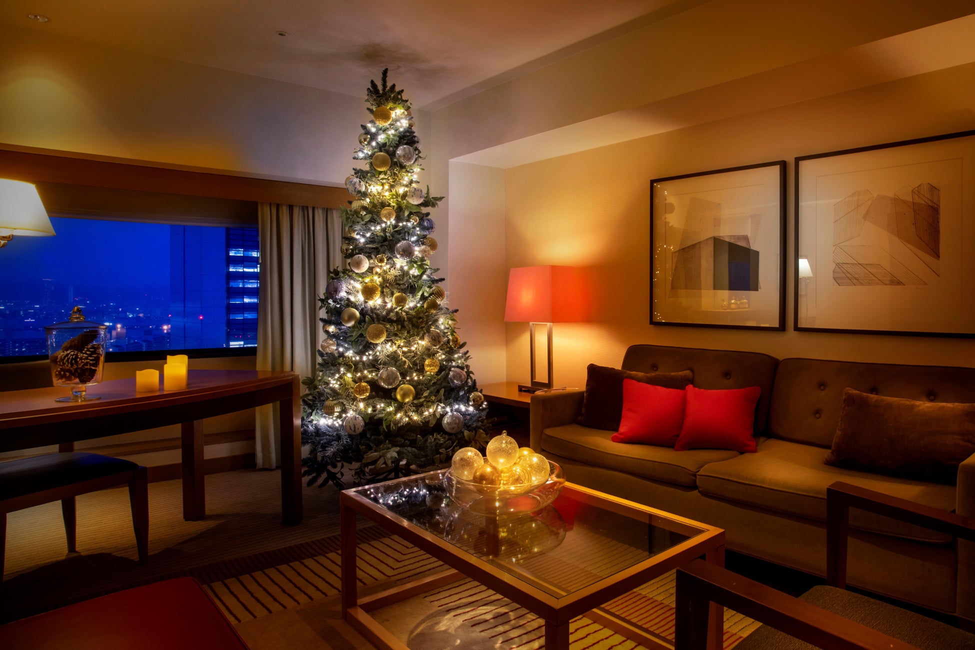 木の風合いを生かした温もりのある本館26Fエグゼクティブスイートルーム(60㎡)に、高さ2.4mのクリスマスツリーやオーナメントを飾り、聖夜をロマンティックに彩る特別な一室に。窓外に広がる冬の神戸の街並みは、夕暮れとともに輝きを増し、柔らかな光とともにお客さまを温かくお迎えします。「クリスマスルーム」でのご滞在は、プライベートな空間でクリスマスの雰囲気をたっぷり味わっていただけると同時に、心と身体を日常から解放し、大切な方と過ごす心穏やかなひとときをお愉しみいただけます。