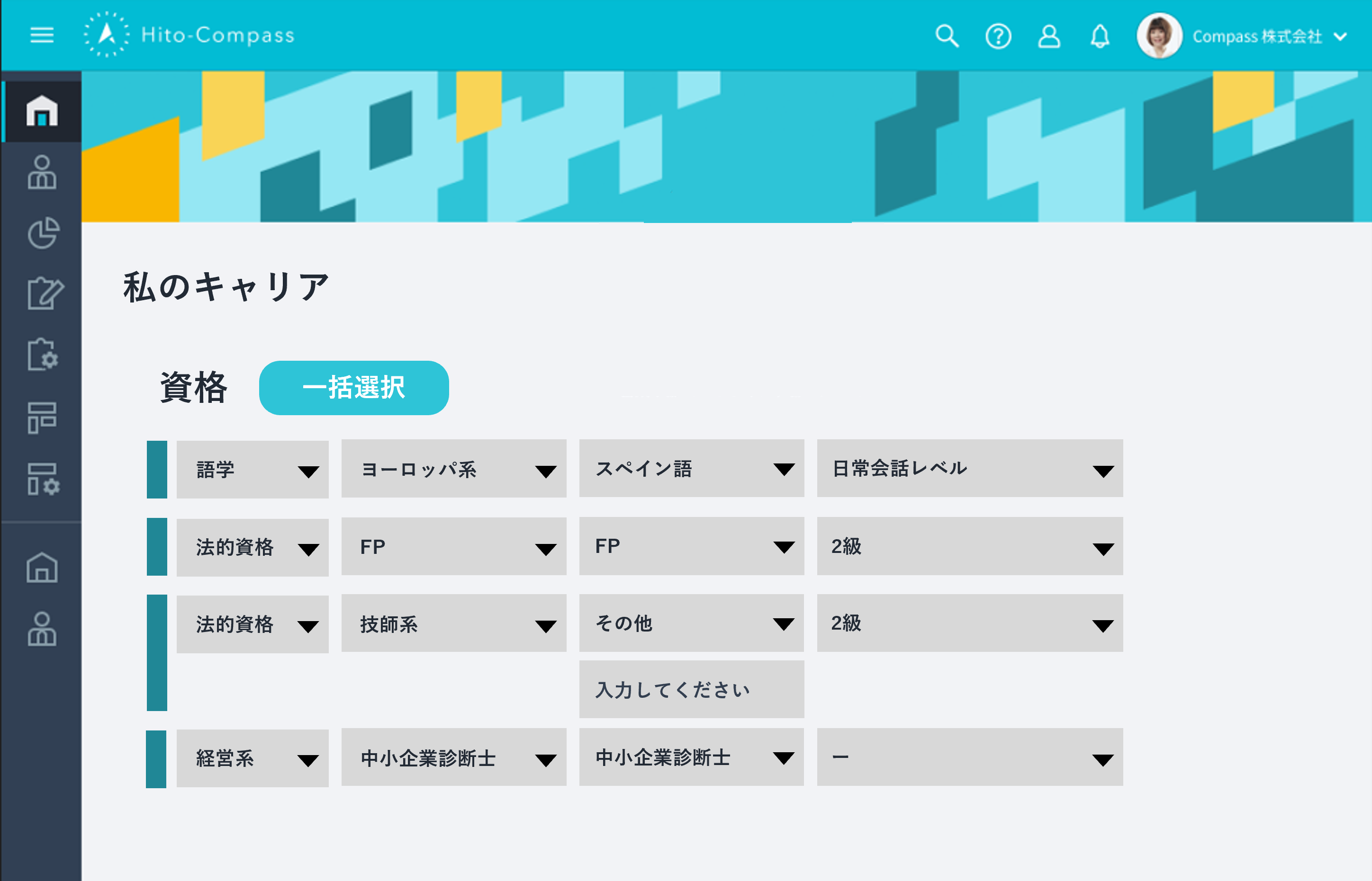 『Hito-Compassキャリア』では、一般的なスキルを網羅したスキル定義をプリセットし、従業員はそこから選択するだけで簡単にスキル入力が可能です。収集されたスキルは、統一の定義で管理されるため、人事による活用もスムーズです。また、スキル定義は企業ごとにアレンジができるため、業界業種問わずお使いいただけるほか、スキル定義のアップデートもサポートいたします。