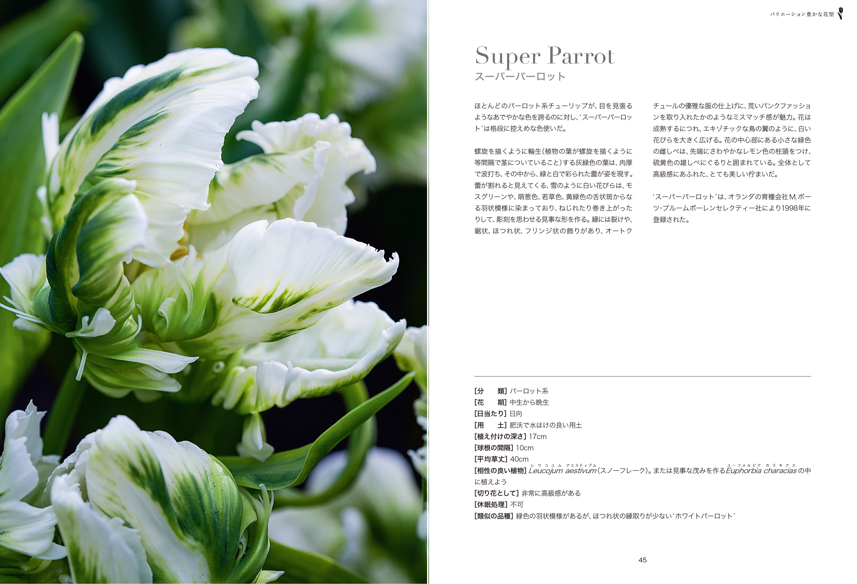 素朴な原種から、人気の火つけ役となったエキゾチックなもの、鮮やかなものまで、日本では珍しい品種も多数掲載。見たことのない品種と出会えるかもしれません。