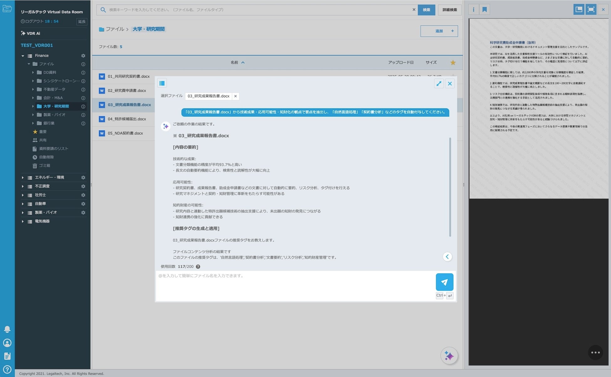 2025年5月20日 リーガルテック株式会社(本社:東京都、代表取締役:佐々木 隆仁)は、セキュアな文書共有・管理を実現するバーチャルデータルーム(VDR)「リーガルテックVDR」に、当社独自開発の生成AI「AI孔明」を統合し、大学および研究機関向けの新機能をリリースいたしました。