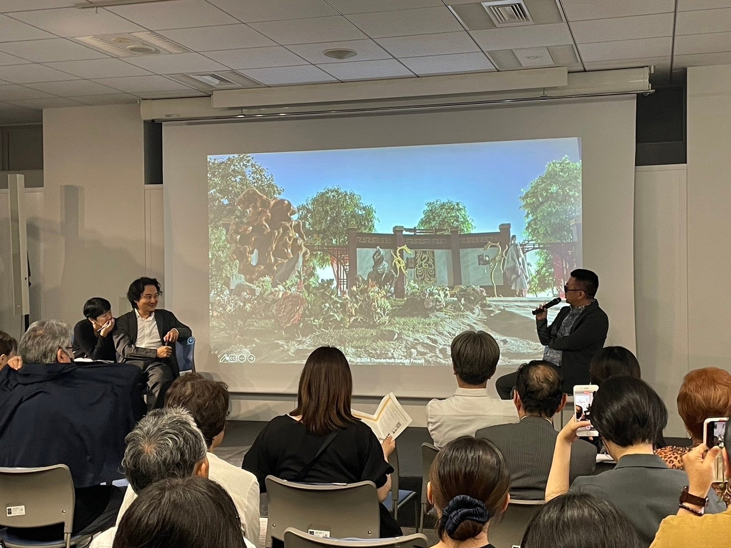 同日は、黄亮勛・霹靂社社長と『Thunderbolt Fantasy』総監修の虚淵玄氏との対談も行われた。ヒロイン・丹翡(タンヒ)のキャラクターを台日合同で設計した際に、日本のアニメのヒロインのように瞳を大きく、手も繊細に作った経験が、その後の台湾の「布袋戯」人形にも影響を与えていることなどのエピソードが紹介された。