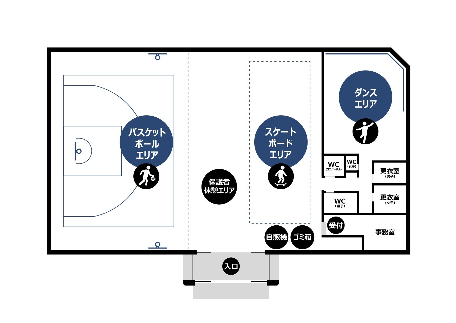 ロックユニット「COMPLEX」などから頂いた寄附金を活用して整備された「子ども向けアーバンスポーツ施設」です。施設内には3×3(スリー・エックス・スリー)バスケットボール、スケートボード、ダンスが楽しめるエリアを備えています。子どもたちがのびのびと遊べる場として利用できるよう、利用料金は無料です。プロを招いたスクールの開催や、イベント会場としての利用も想定しています。