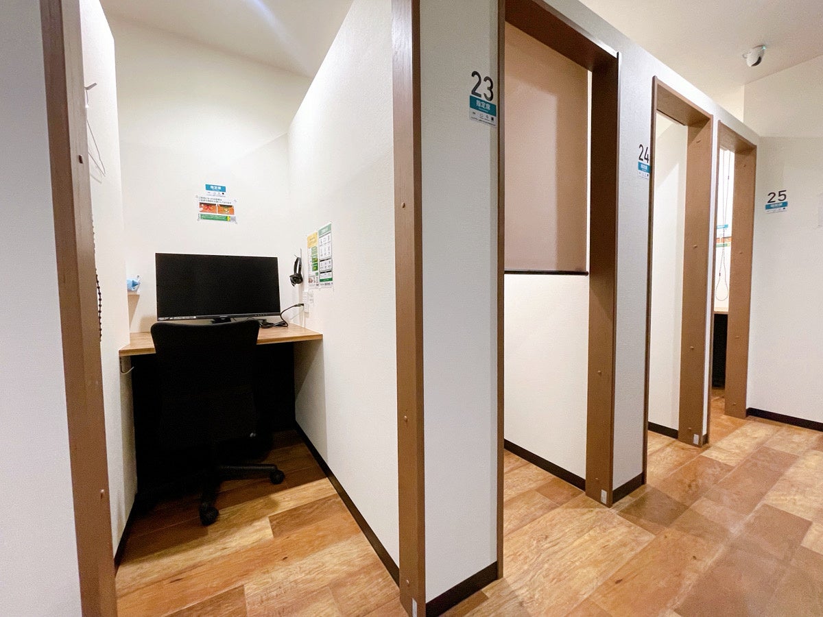 半個室はロールカーテン付きのため、完全個室と同様に周囲を気にせずに、ご利用いただけます。もちろん、半個室も全席モニター付き。広々したデスクで作業に集中できる環境をご提供します。