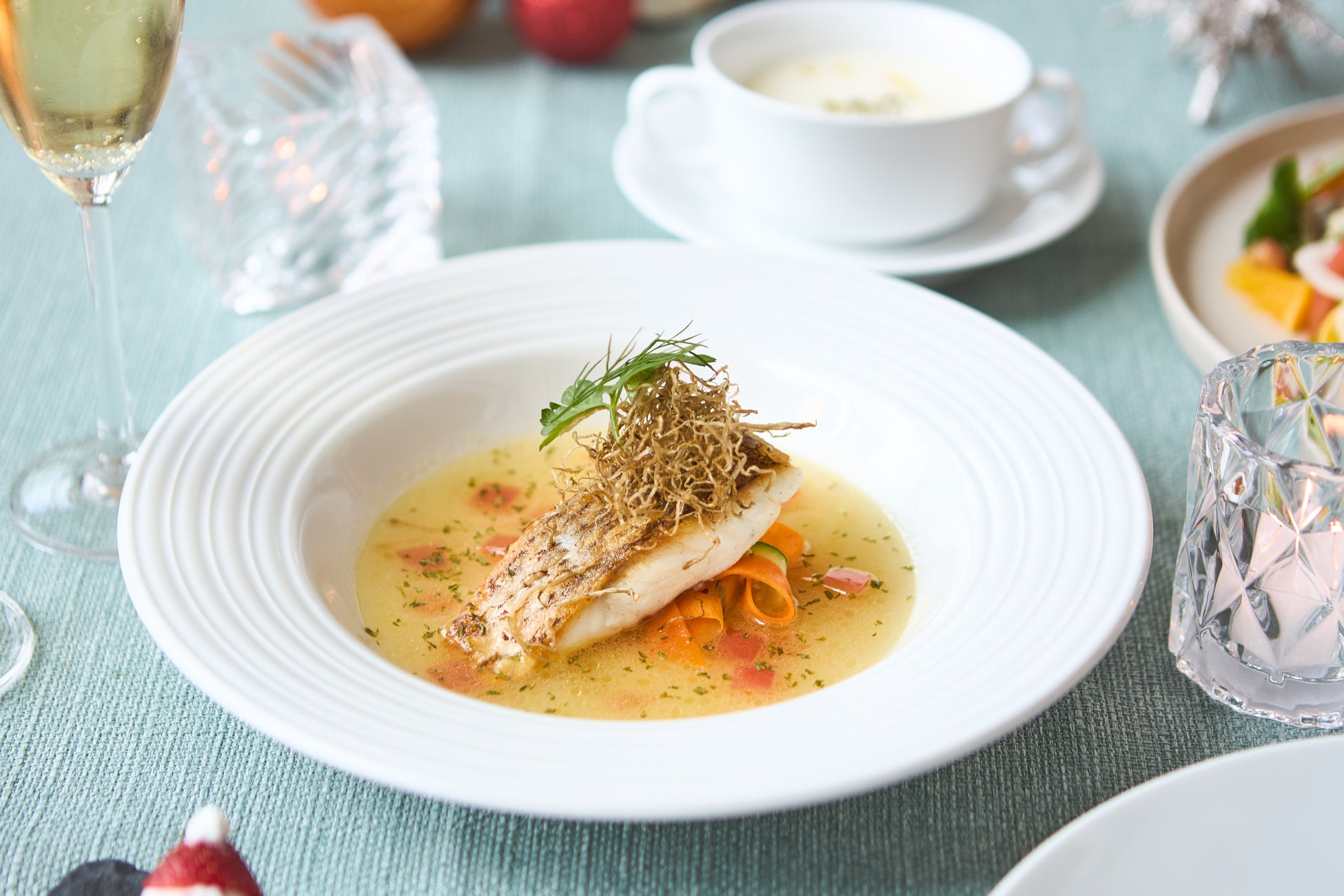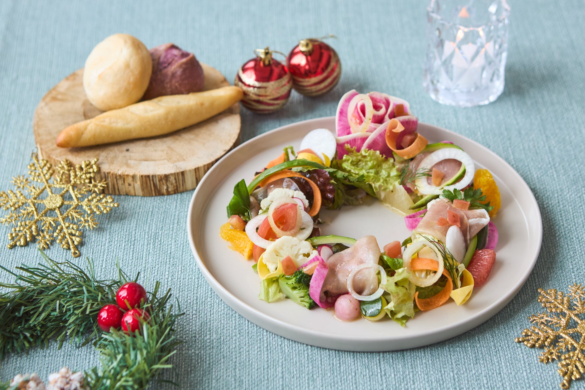 前菜には、生ハムと10種類以上の野菜を使い、華やかなクリスマスリースに見立てたサラダをご用意。オレンジ香るヴィネグレットドレッシングで、爽やかに仕上げました。