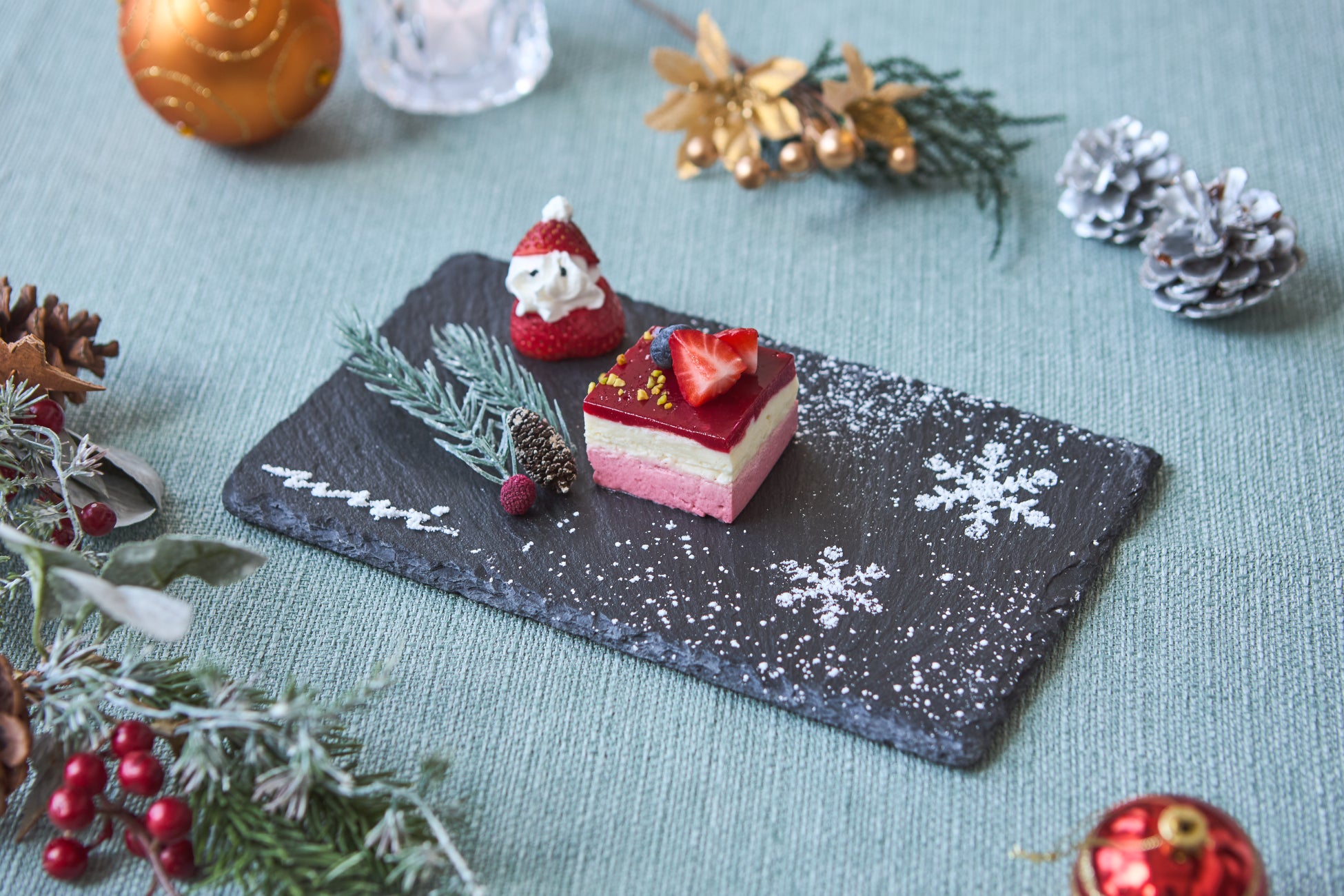愛らしいサンタクロースが目をひくデザートは、フランボワーズのジュレとレアチーズ、フランボワーズムースの3層で構成された甘酸っぱい味わい。ピスタチオの緑とフランボワーズの赤が、クリスマスらしさを演出します。