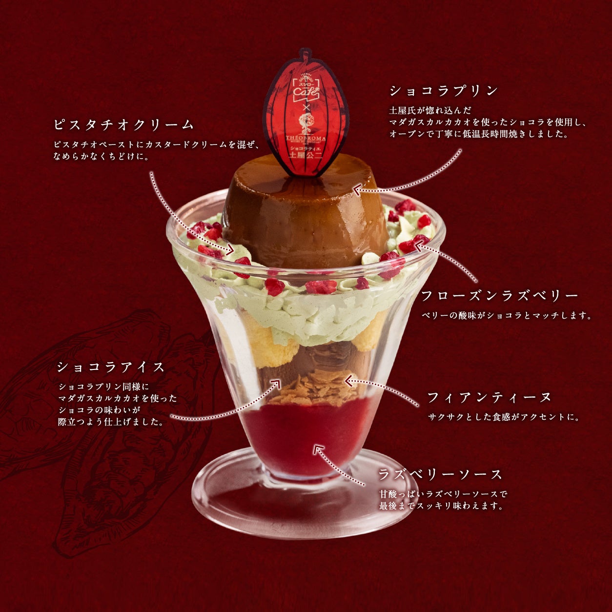 「テオブロマ」定番のショコラプリンから着想を得て作り上げた、新たなショコラプリンをパフェのトップに象徴的に盛り付けました。低温でじっくり焼き上げたショコラプリンは、土屋氏が世界のいくつものカカオ農園を訪問した中で出会い、惚れ込んだマダガスカルのカカオ豆を使用しています。マダガスカルのチョコならではの、ベリー系のフルーティーで華やかな香りと濃厚なカカオの味わいが感じられ、なめらかな食感がチョコ好きを魅了します。その下には同じチョコを使用したショコラアイスに加え、なめらかなピスタチオクリームの風味、酸味のあるラズベリーソース、サクサクのフィアンティーヌが、いずれもいいアクセントとなって、ふくらみのある味わいをつくりあげています。