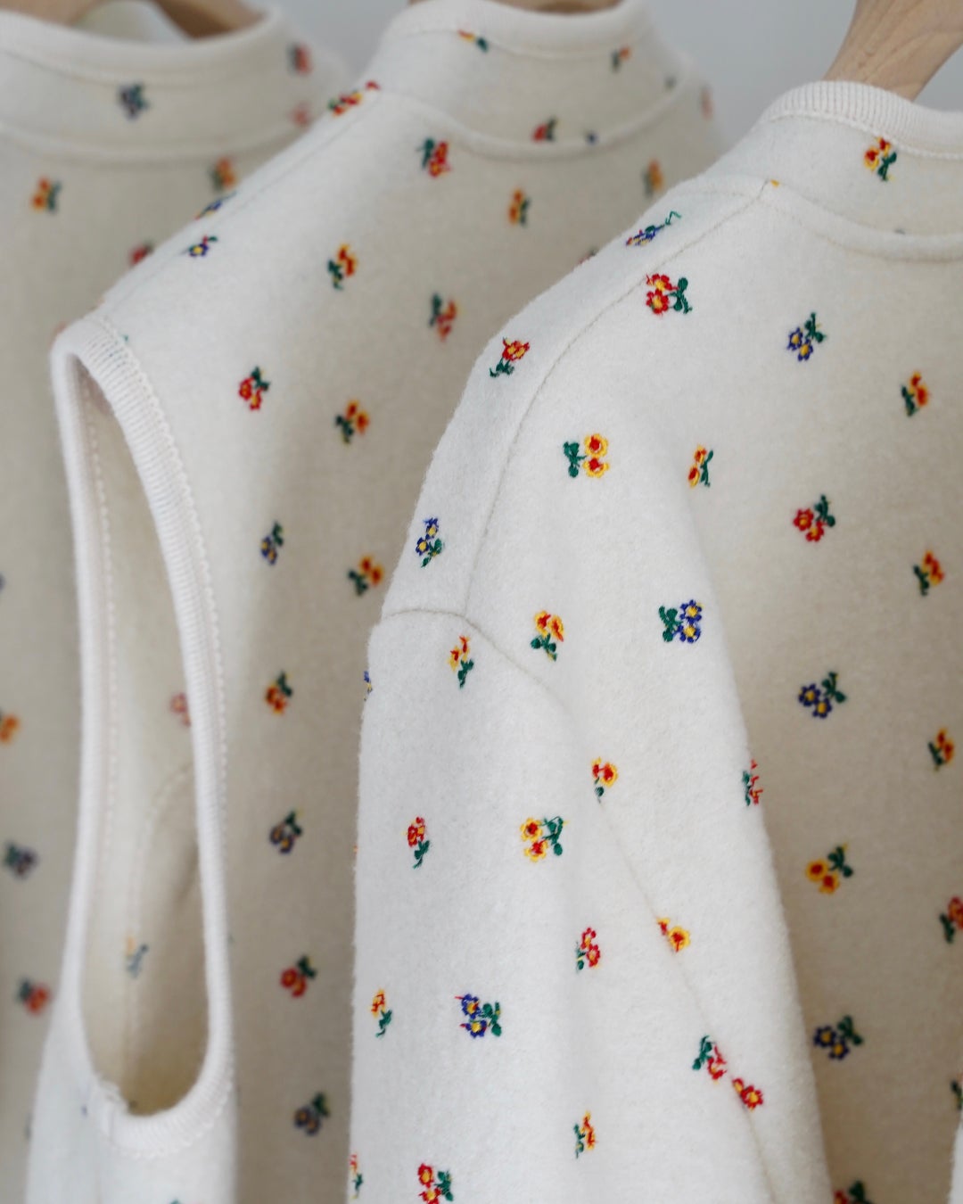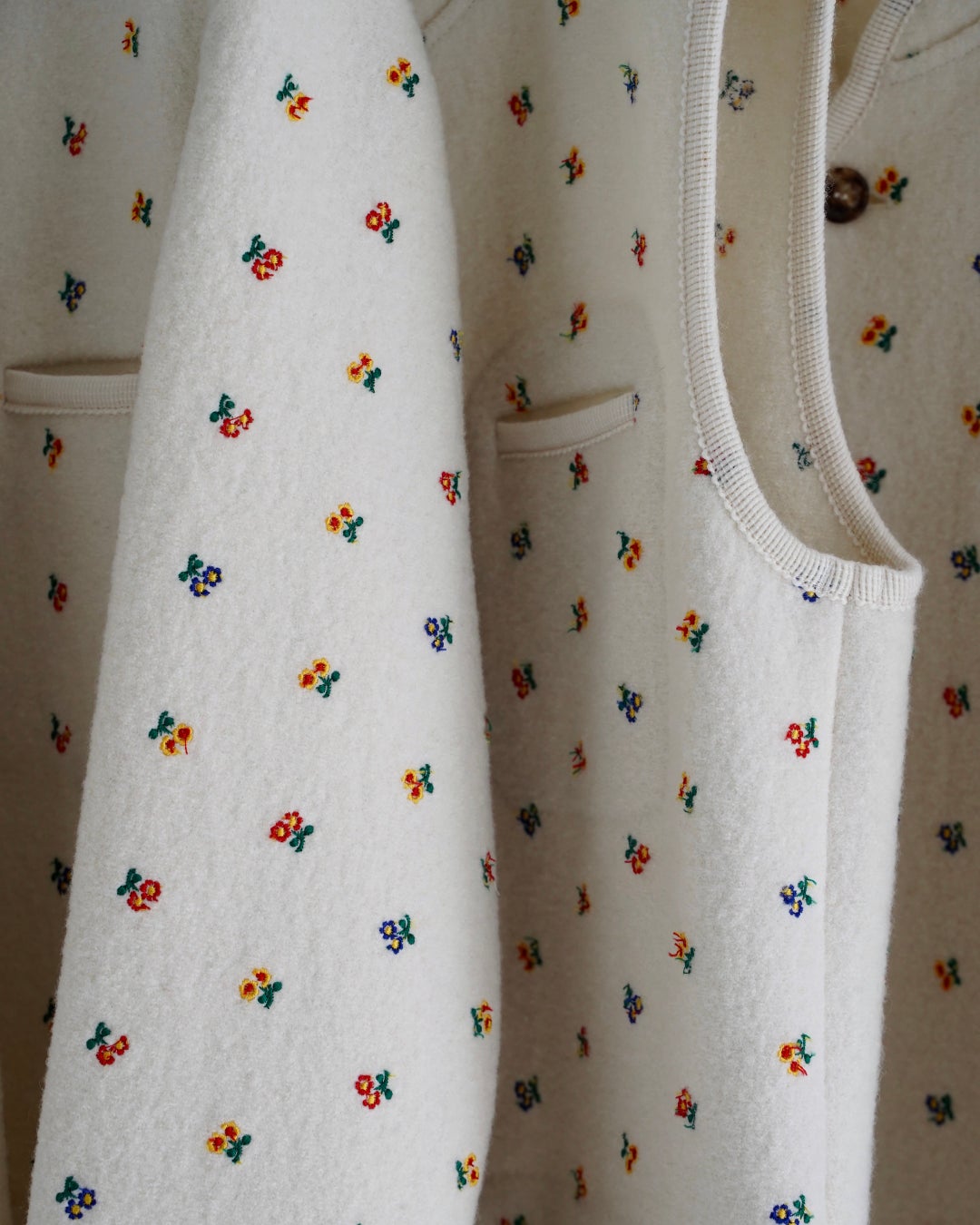 ホワイトの<Mnessmer(モエスマー)>社の生地に職人技術を駆使した色鮮やかな花刺繍が美しくも力強いコレクションになっています。