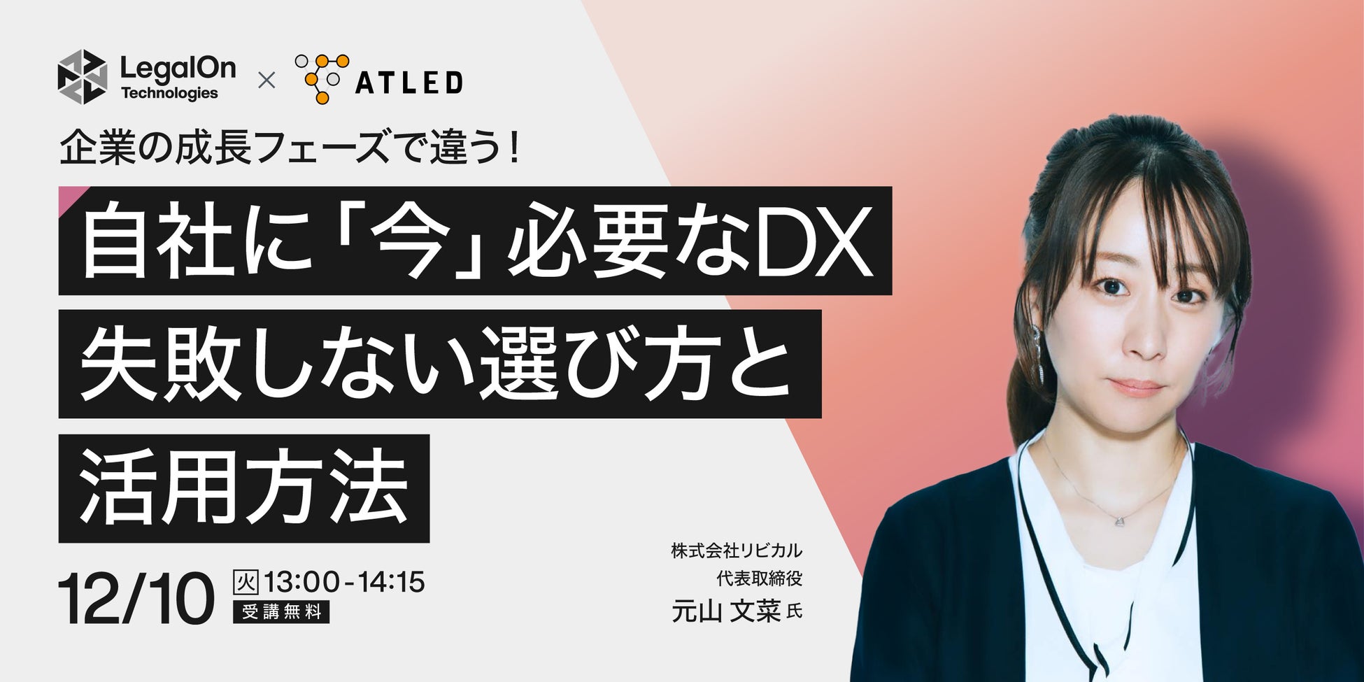 ※お申込みいただいた方へ、開催前日に視聴用URLをメールにてご案内いたします。前日正午までに案内メールが届かない方は、お手数ですが、 seminar@legalontech.jp までお問合せください。