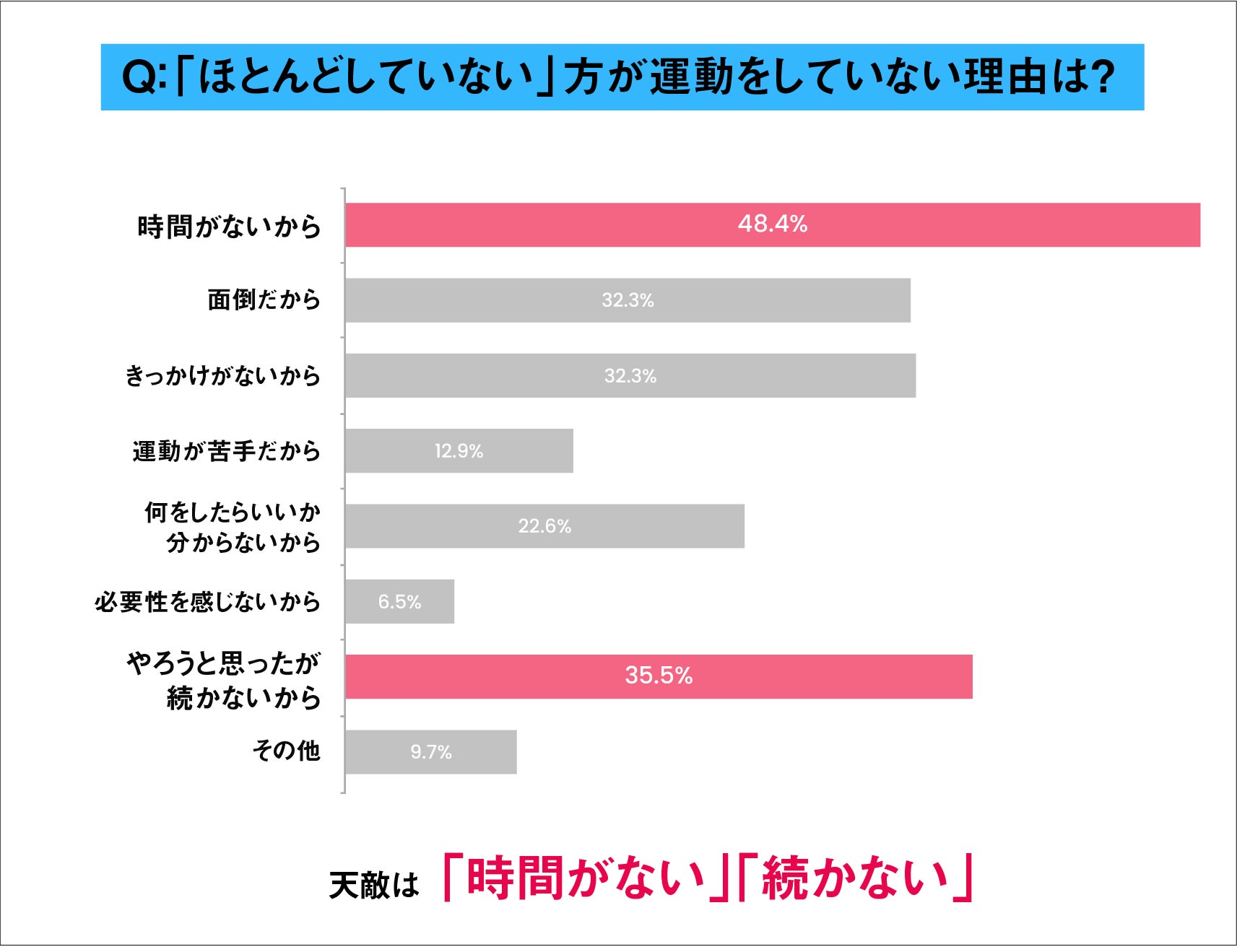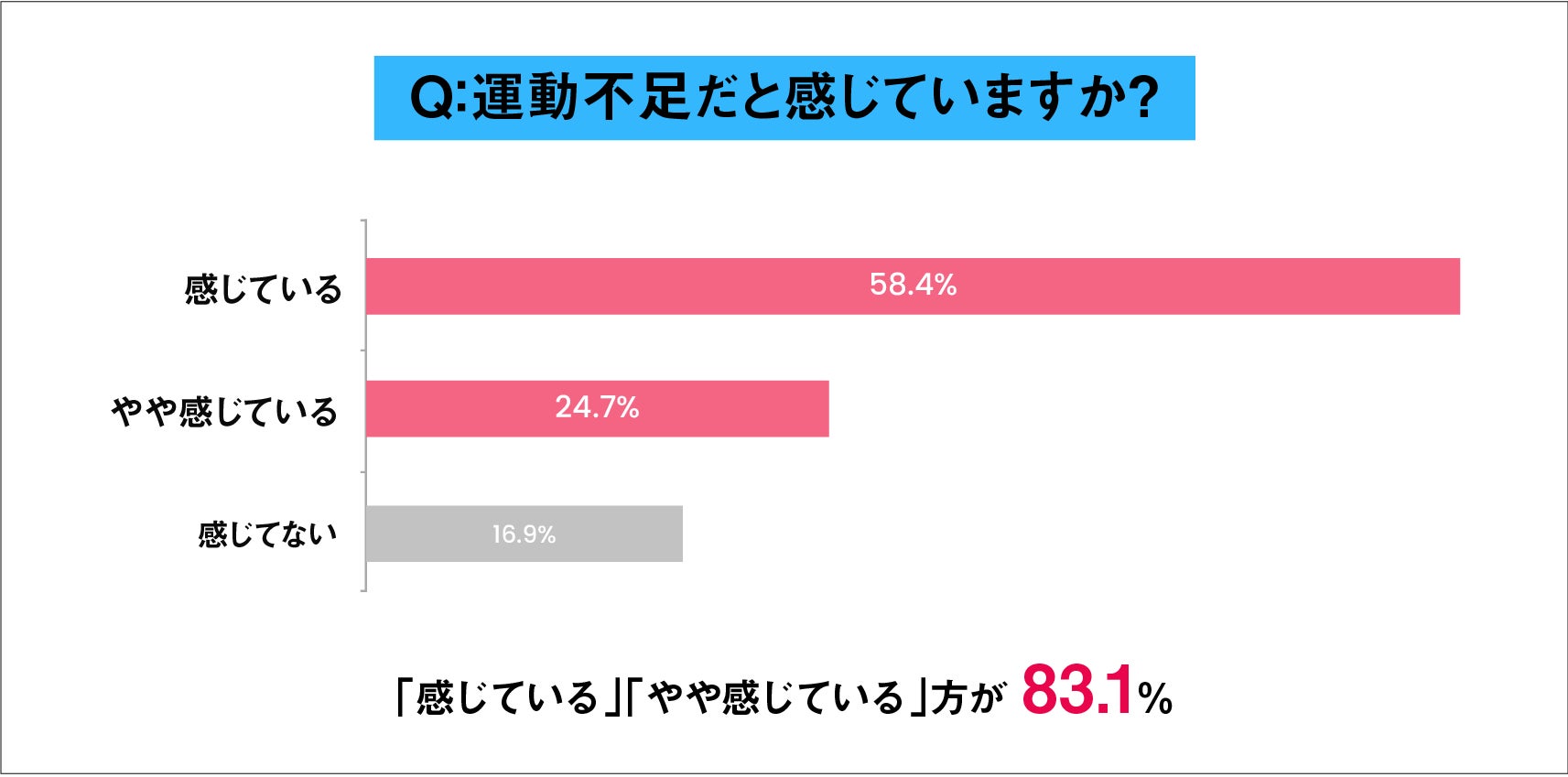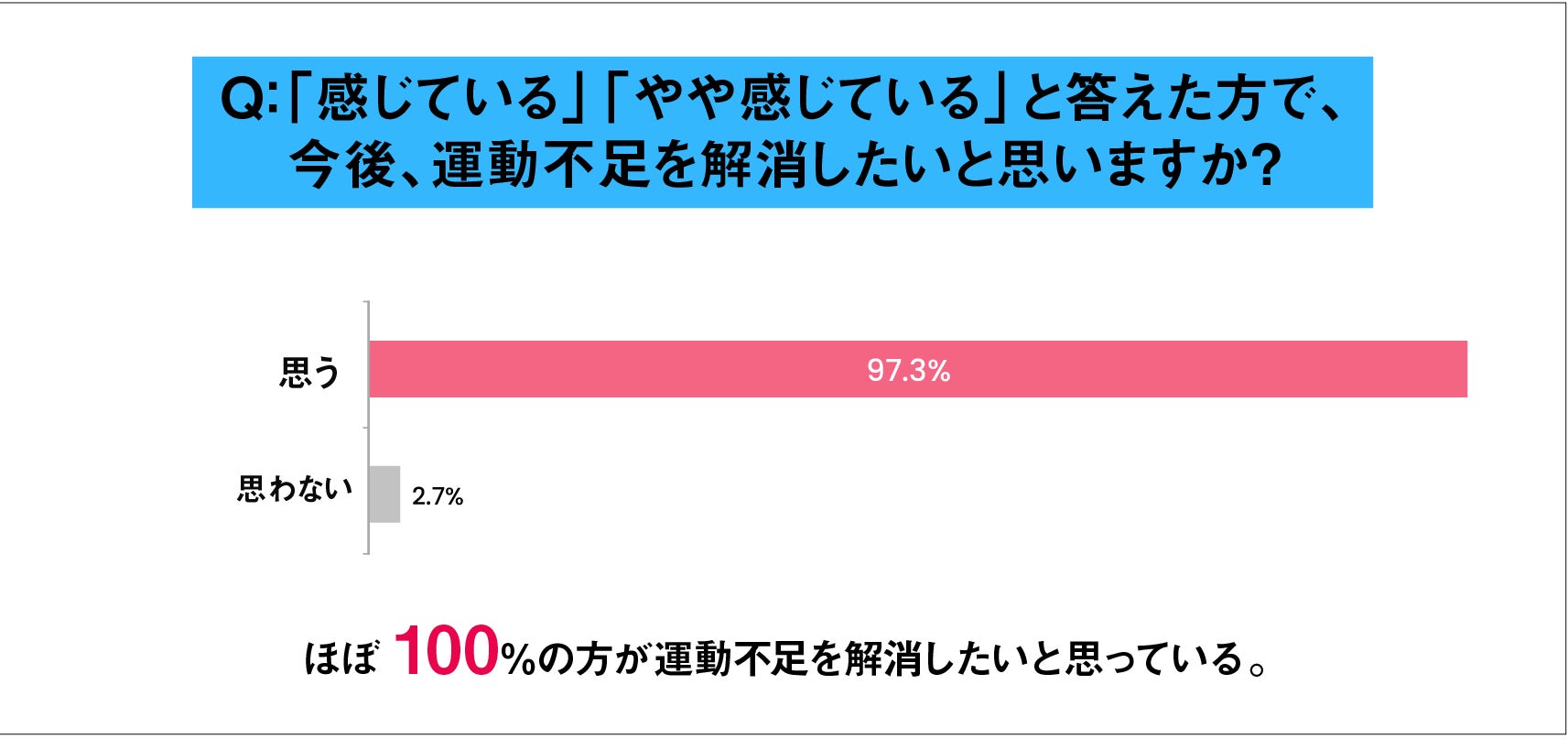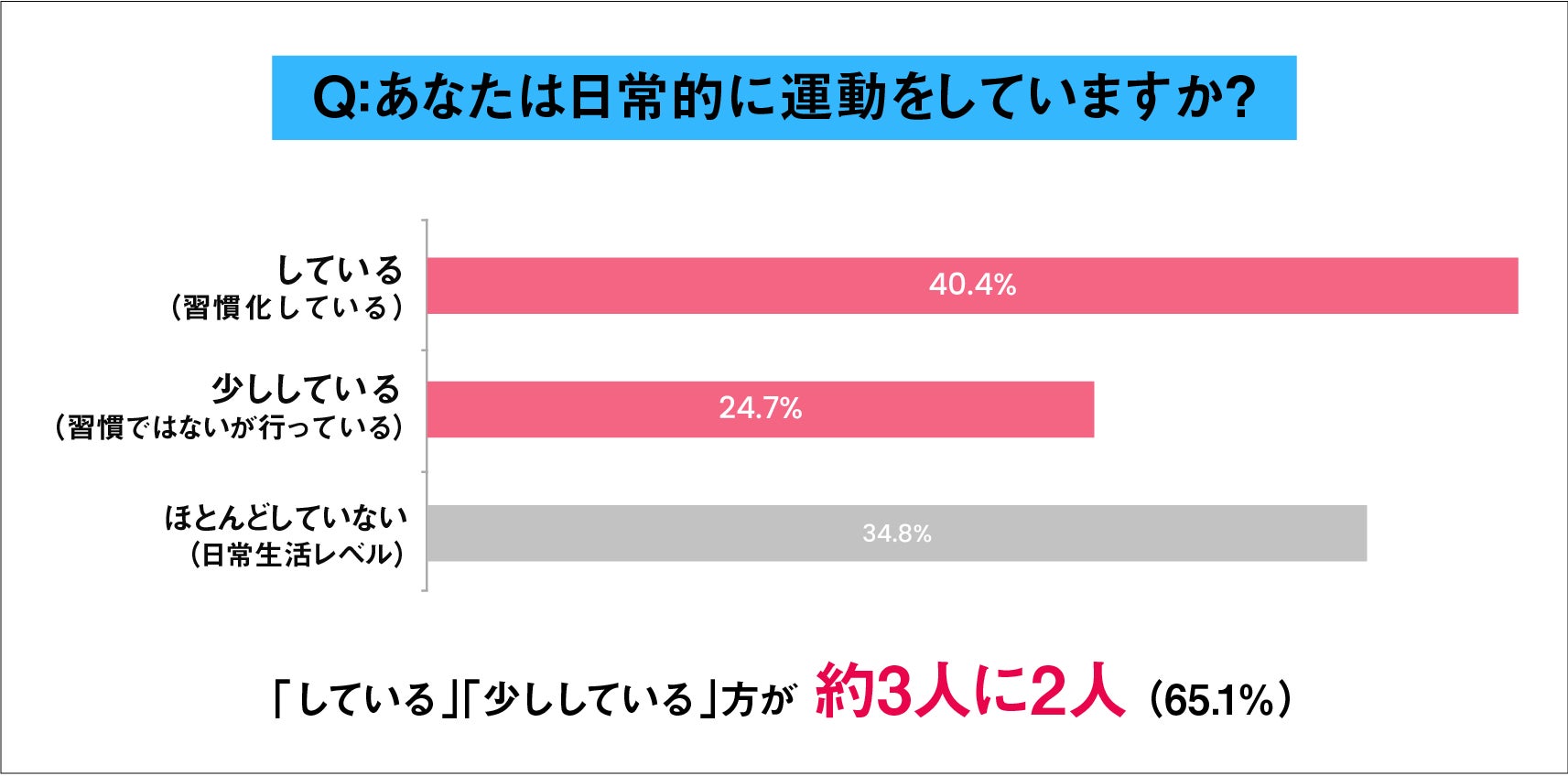 タカラベルモントでは、美容師・理容師の皆さまに「運動に関する」独自アンケートを実施し、約65%の方が日常的に運動をしていることがわかりました。しかし一方、運動不足だと感じている方は8割を超え、そのうち「運動不足を解消したい」と回答した方はほぼ100%という結果に!立ち仕事が基本の美容師・理容師の皆さま。鏡の前でお客さまに笑顔で向き合い、確かなカット技術やヘッドスパなどメニューを提供するために、日頃の健康や体力維持に強く関心を持ち、良い方向に変えたい、と思っている方が多いことがわかりました。