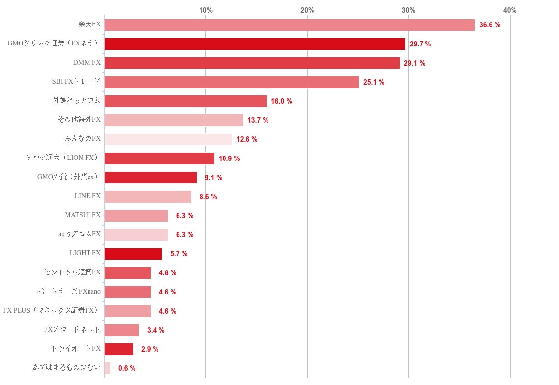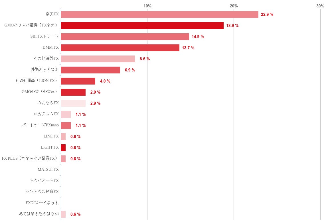楽天FXが36.6%で最も多く、GMOクリック証券(FXネオ)が29.7%でこれに続いた。また、DMM FX(29.1%)、SBI FXトレード(25.1%)なども人気が高かった。