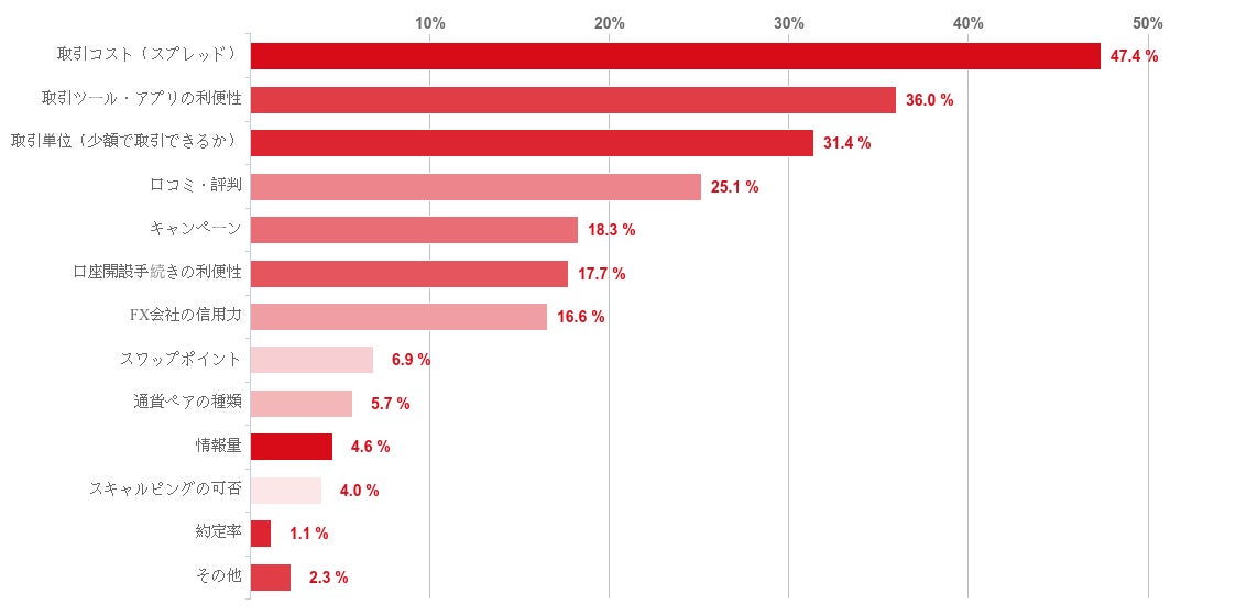 「取引コスト(スプレッド)」が47.4%で最も多く、「取引ツール・アプリの利便性」が36.0%でこれに続いた。なお、その他にも「取引単位(少額で取引できるか)」「口コミ・評判」「キャンペーン」など様々な項目に回答が集まった。