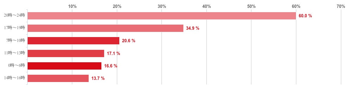 「20時〜24時」が60.0%で過半数を超え、圧倒的に多かった。なお、その他は「17時〜19時」が34.9%、「7時〜10時」が20.6%であった。