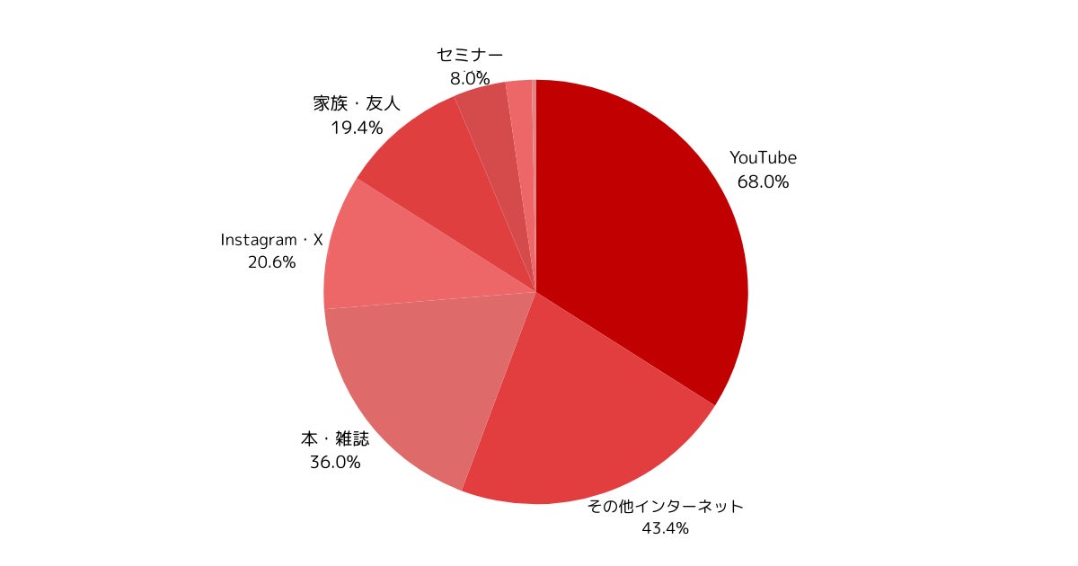 YouTubeが68.0%で最も多かったが、「その他インターネット」(43.4%)、「本・雑誌」(36.0%)もこれに続いた。