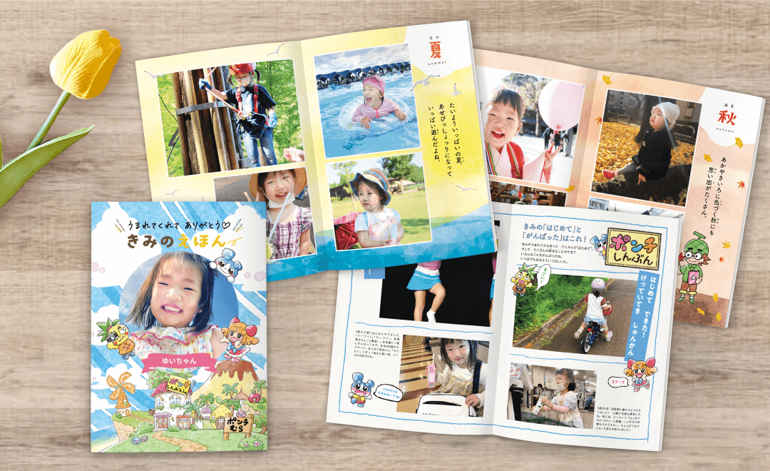 オリジナルテンプレートデザインには、「あんふぁん」「ぎゅって」の人気連載「できたて!ポンチポンチ」のキャラクターを採用。同作のおはなし風に作られたページに25枚の写真を当てはめると、世界にひとつだけのわが子が主人公の絵本風フォトブックが完成。四季をイメージしたページがあり、入れられる写真は1シーズン4枚。16枚選ぶとあっという間に春夏秋冬の記録ができあがります。途中保存が可能なので、忙しいママも家事やスキマ時間で作成が可能です。