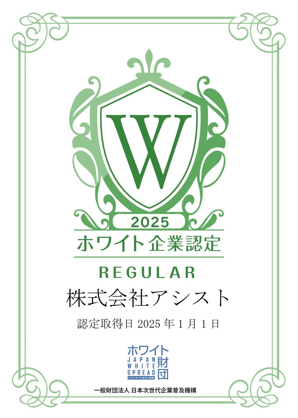 システム・アプリケーションの開発、SEO対策やMEO対策、WEB制作からサポートまでをワンストップで提供する株式会社アシスト(本社:東京都千代田区、代表取締役社長:宇井 和朗、以下 アシスト)が、2025年1月1日「ホワイト企業認定 レギュラー」を2年連続で取得したことをお知らせします。