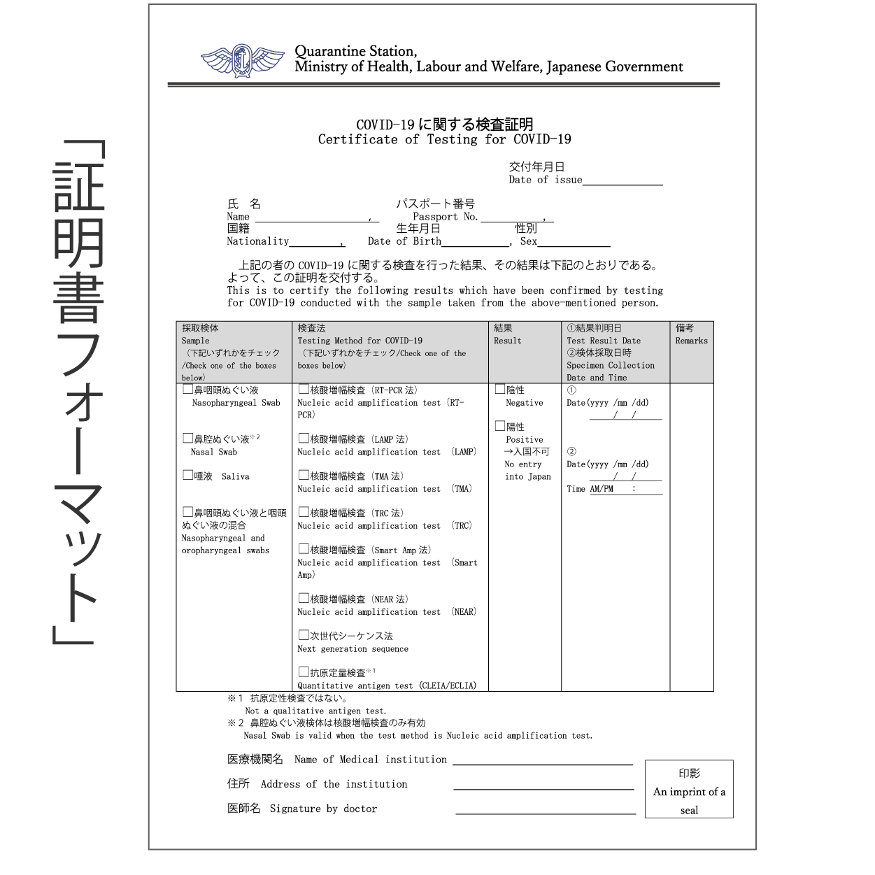 医療機関によるPCR検査・外務省指定「出国前検査証明フォーマット」を使用・40カ国以上対応