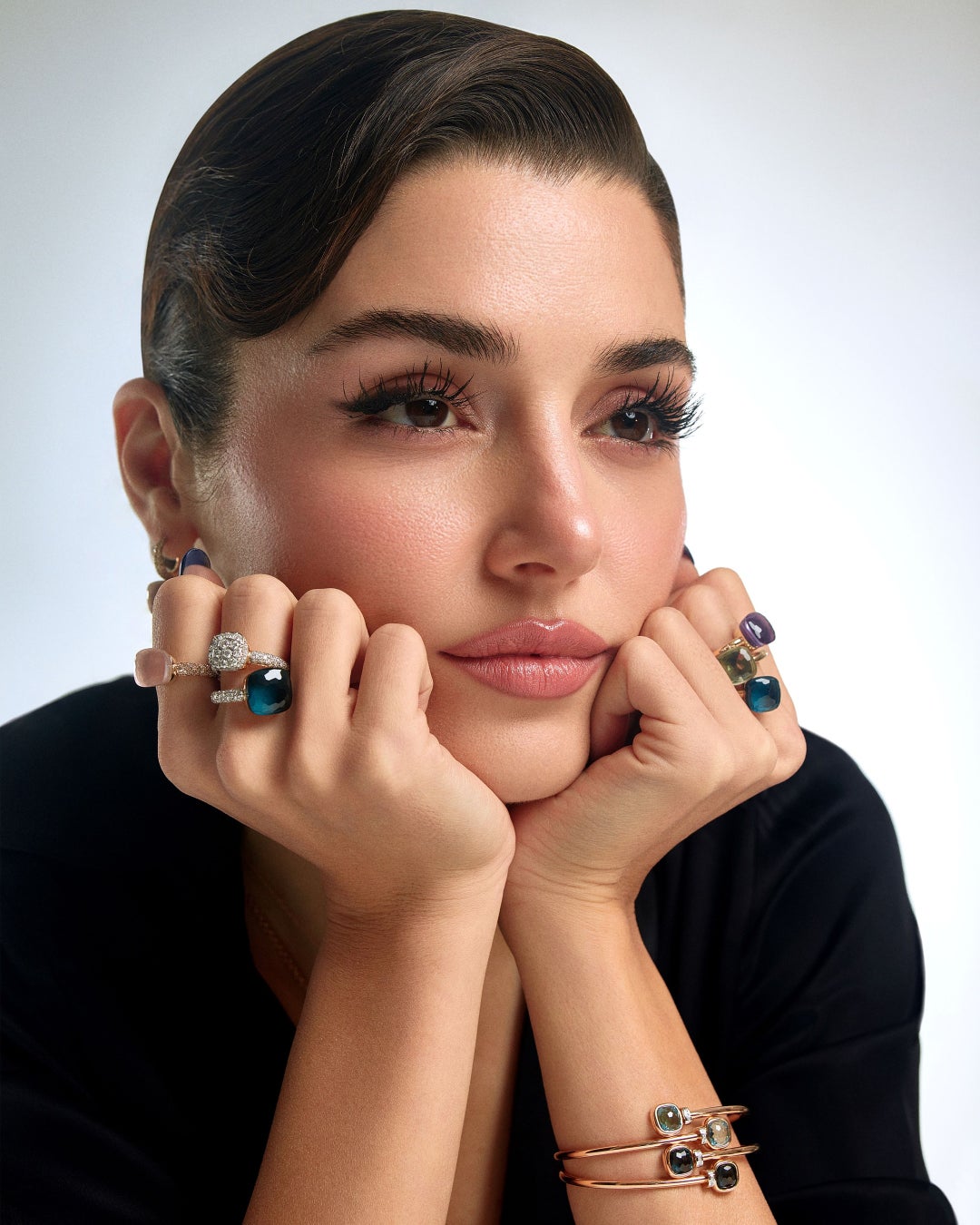 今回のコラボレーションのために特別に撮影されたポートレートにて、エリチェーレはメゾンの象徴的な「ヌード」コレクションから自身のお気に入りのジュエリーを身に着けています。