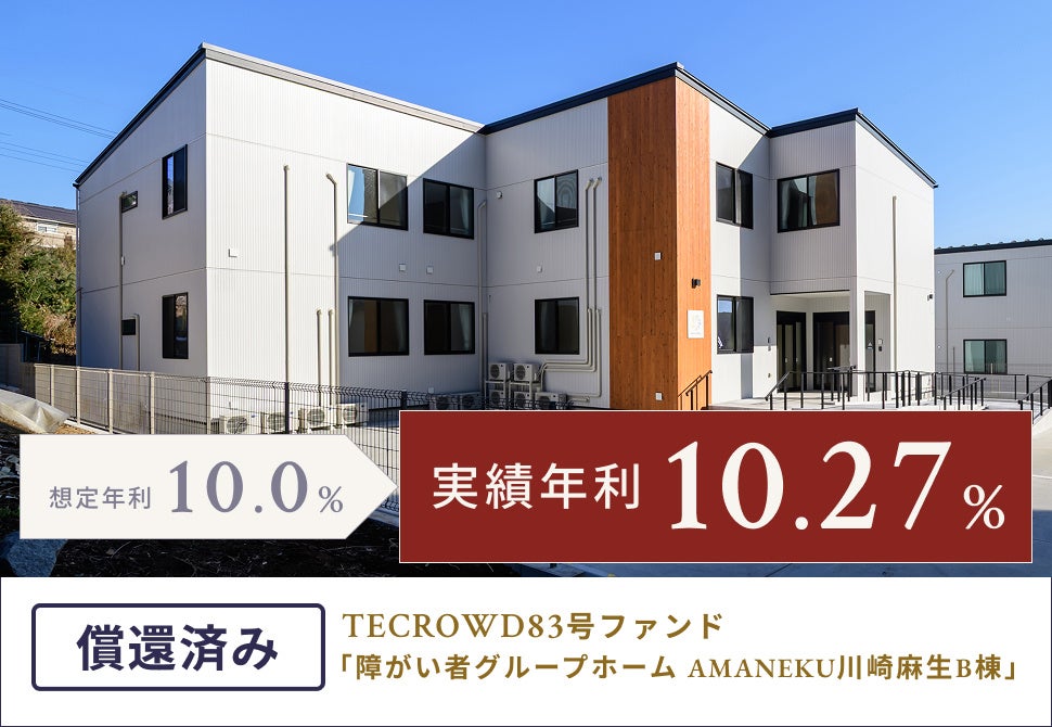 TECRA株式会社(本社:神奈川県横浜市西区、 代表取締役社長:新野博信)は、当社が運営する不動産クラウドファンディングサービス「TECROWD」の83号ファンド「障がい者グループホーム AMANEKU川崎麻生B棟」が、2026年3月25日に運用を終了し、同年3月31日に元本償還および配当金支払を完了したことをお知らせいたします。