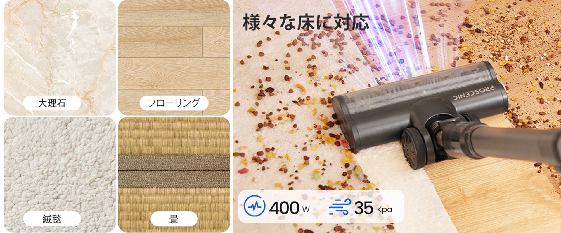 ◎Proscenic P11 Mopping は、400Wのモーターと35000Paの吸引力を備え、カーペットや畳などの床材に対応し、微細な埃やペットの毛髪、汚れ、猫砂などを簡単に取り除きます。