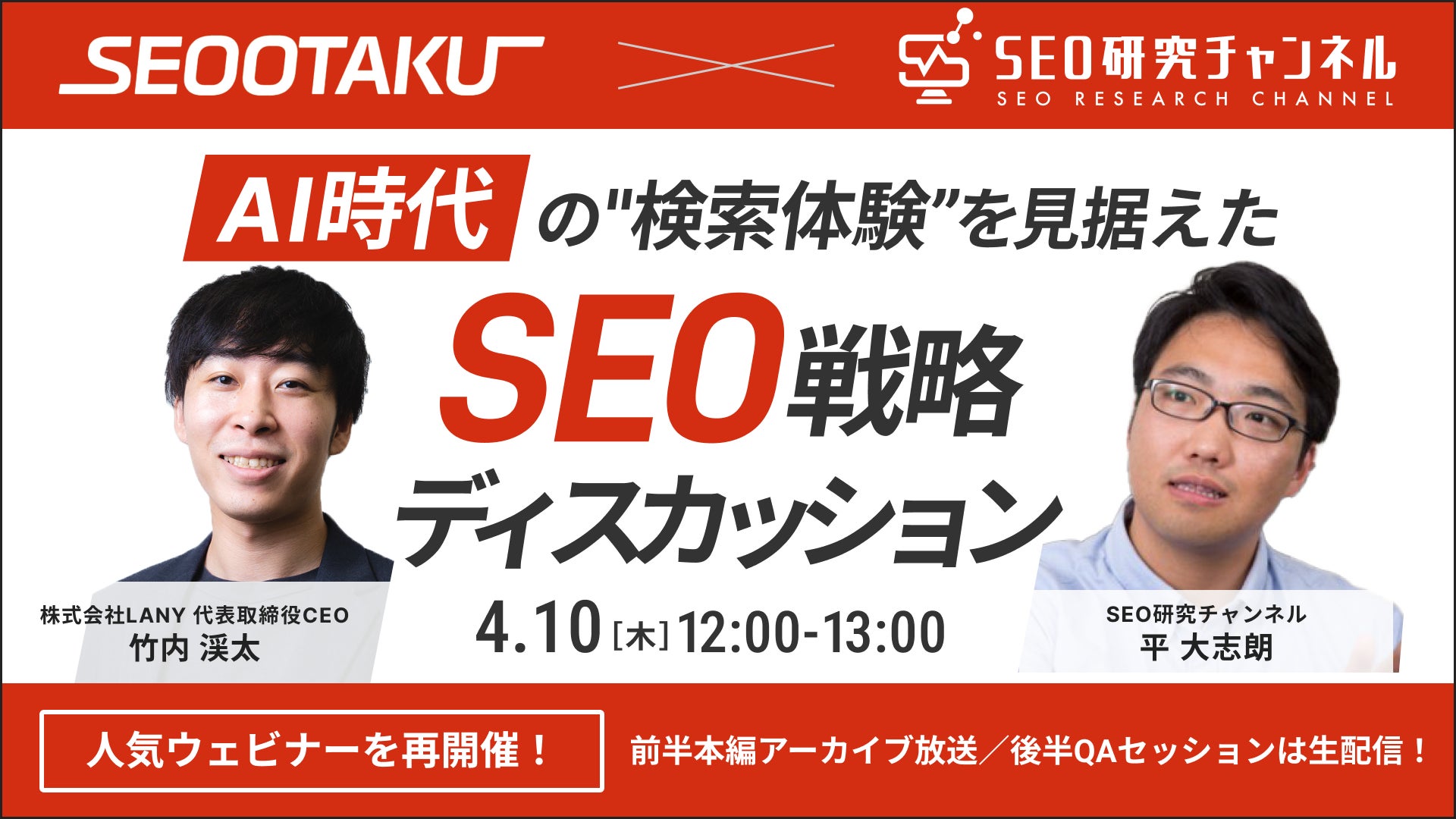 YouTubeチャンネル 「SEOおたく / LANY」(登録者数1.2万人)を運営するLANY代表・竹内と、「SEO研究チャンネル」(登録者数1.8万人)を運営する平氏が、リアルなデータと実感をもとに徹底解説&ディスカッション!