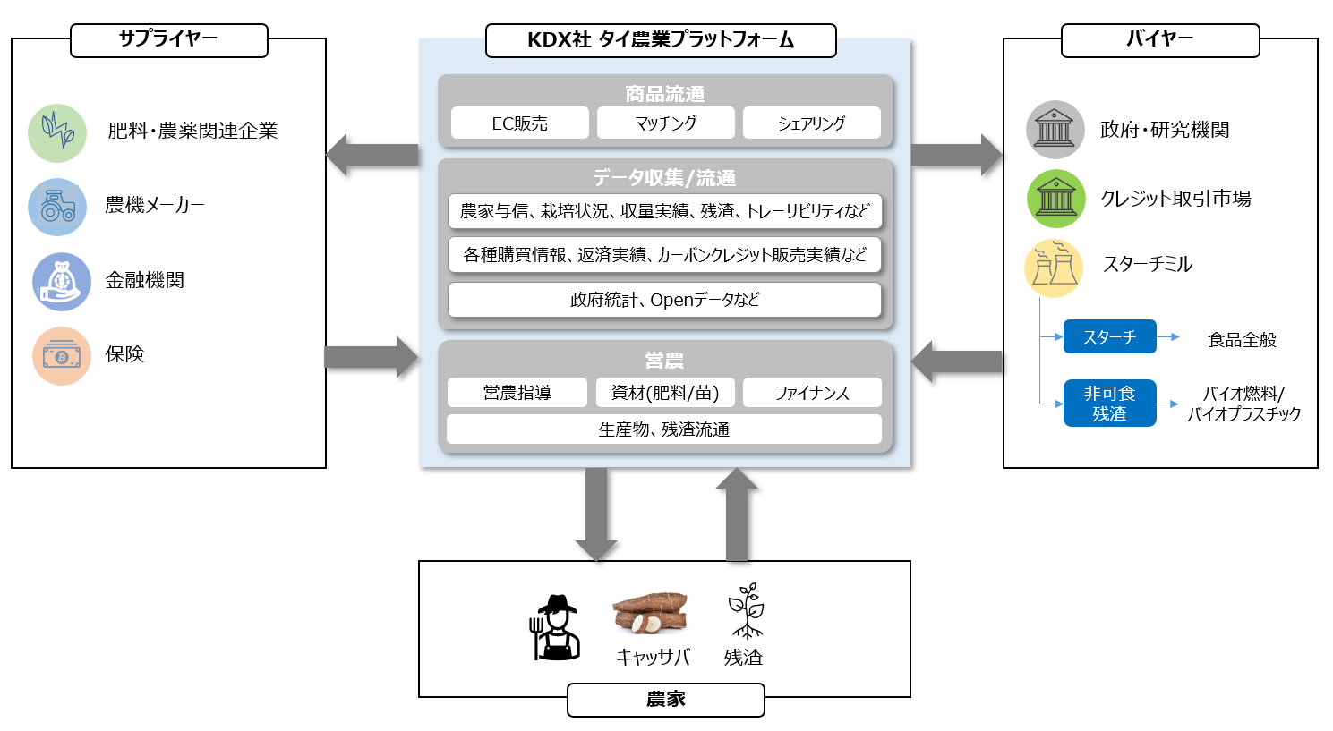 KDXはまず、キャッサバ農家の課題に対して解決策となる総合的な営農支援サービスを提供します。ユーザーとなる農家は、資金負担を抑えた形で肥料や苗などの資材の提供や営農に関するアドバイスを受けることができ、収穫量増加を目指す仕組みです。作物シミュレーターを活用し、土壌データ、天候データなどを元に、適切な肥料の選択、量、タイミングといったデータに裏付けされた解決策などが提示されます。更には、双日独自開発のアプリを活用して蓄積した、ユーザーの農地や保有機材、資材や作物の生育状況、収穫量などのデータを元に、作物加工会社や農業資材・農機メーカー、金融機関などが農家に対して、商材・サービスをプラットフォーム経由で提案・提供する予定です。