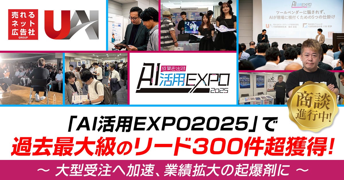 売れるネット広告社グループ株式会社(本社:福岡県福岡市、代表取締役社長CEO:加藤公一レオ、東証グロース市場:証券コード9235、以下 売れるネット広告社グループ)は、このたび、連結子会社である売れるAIマーケティング社株式会社が2025年9月9日・10日に開催された「AI活用EXPO2025」に出展し、2日間で300件を超える過去最大級のリードを獲得しましたことをお知らせいたします。
