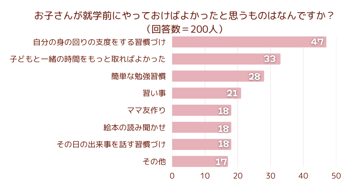 【調査結果】お子さんが就学前にやっておけばよかったと思うものはなんですか?1位は『自分の身の回りの支度をする習慣づけ』!