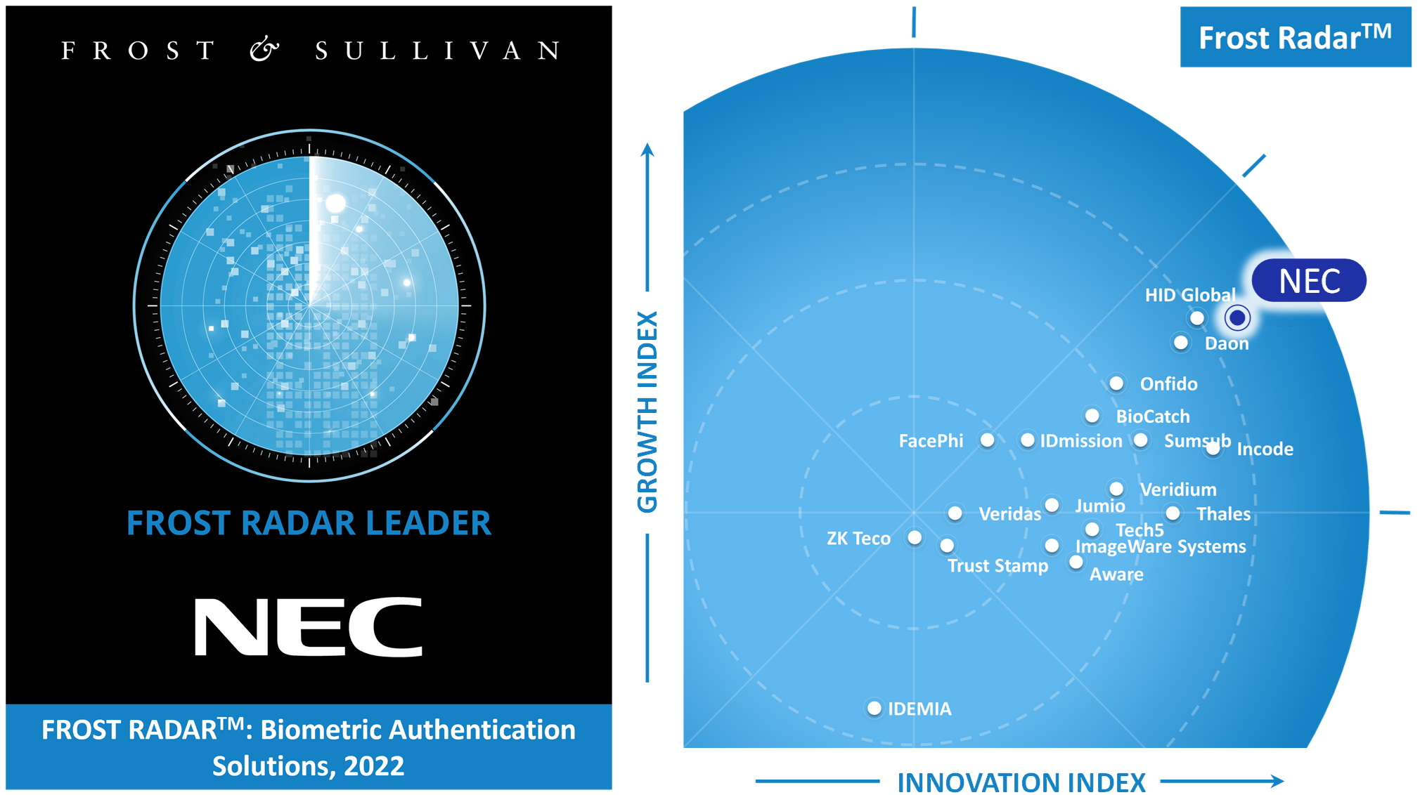 今回の市場調査でFrost&Sullivanは、NECの幅広い生体認証事業ポートフォリオに対する継続的なイノベーションの成果として、NECがフロストレーダー™における2つの評価軸、成長指数とイノベーション指数の両方でリーダーシップのスコアを獲得したと評価しました。