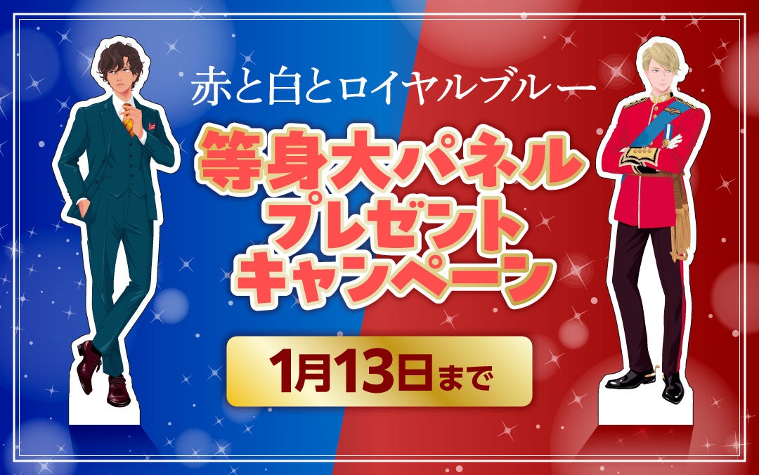 BL電子書籍サービス La Roseraie(ラ・ロズレ)では、12月27日(金)より『赤と白とロイヤルブルー 』表紙イラストを使用した等身大パネルセットを抽選で1名様にプレゼントいたします!