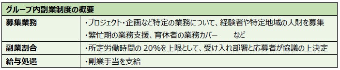 グループ各社から、新規事業立ち上げやDX推進、特定業務経験の知見活用等の求人案件を集約し、社内イントラネットを通じて希望者を募ります。今後は、繁忙期や産育休のサポートといった臨時的な人財フォロー機能も持たせていく予定です。また、副業にあたり「副業手当」を支給することで、本人のチャレンジを待遇にも反映していきます。