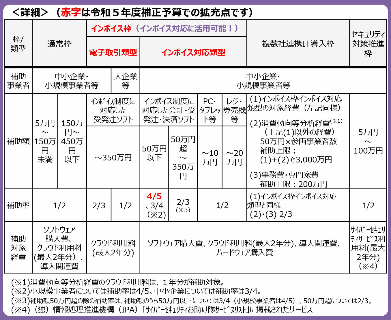 ・小規模事業者は最大4/5補助し、補助下限は無く安価なITツール導入も支援。