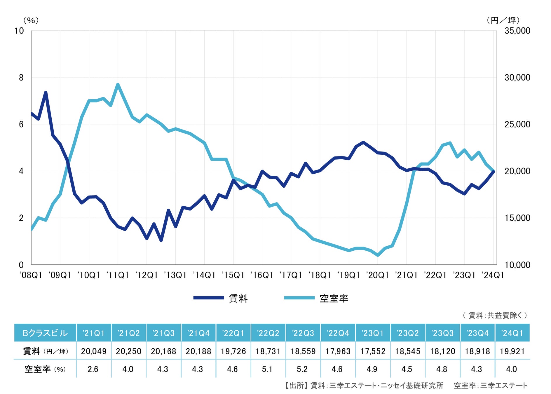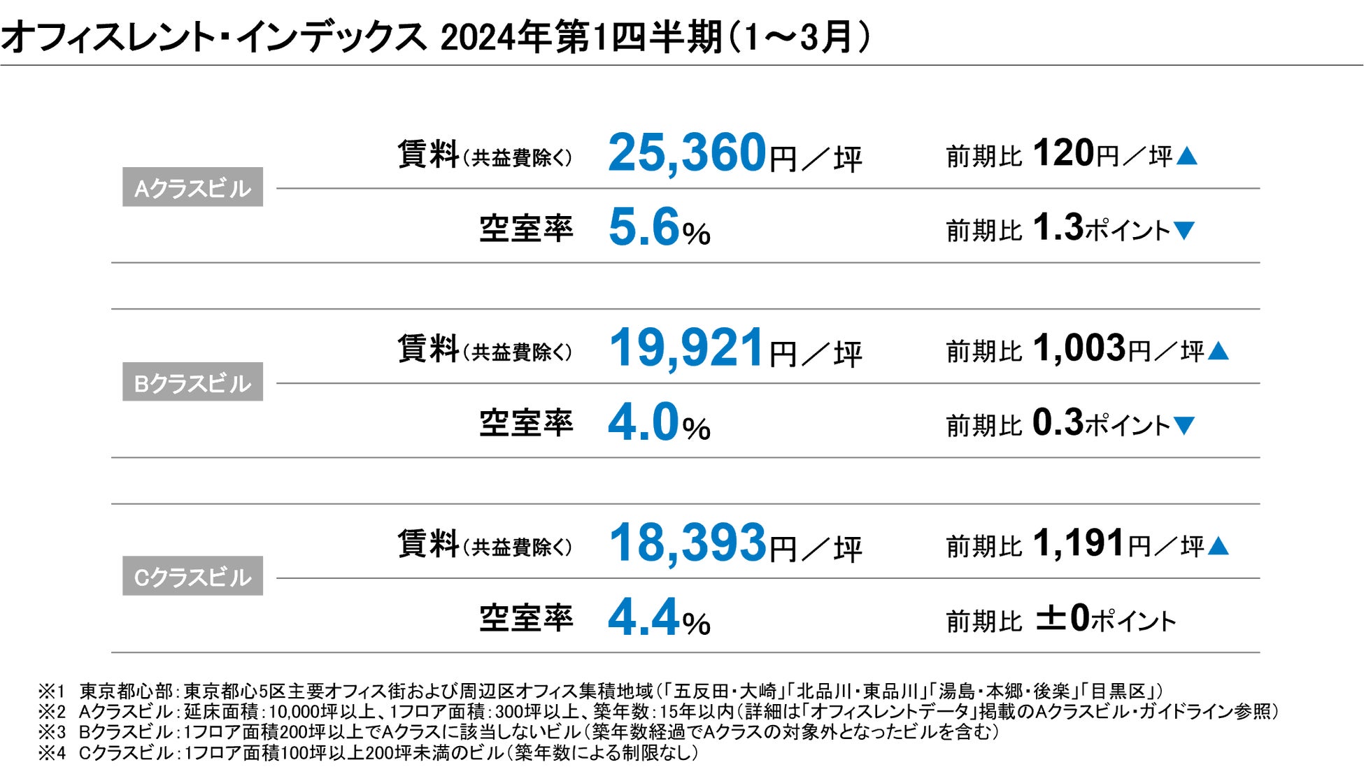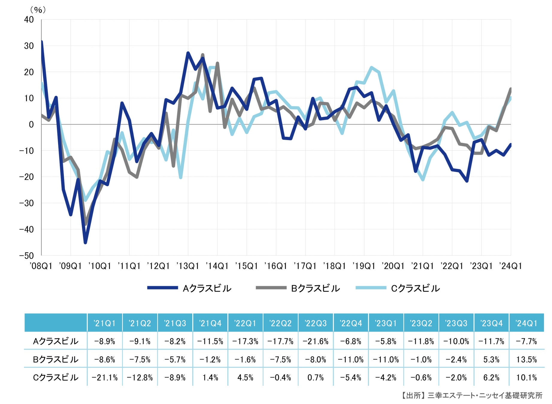 2023年第1四半期との比較による対前年変動率は、Aクラスビルがマイナス7.7%、Bクラスビルがプラス13.5%、Cクラスビルがプラス10.1%だった。Aクラスビルは16期連続のマイナスとなった。一方、BクラスビルおよびCクラスビルは2期連続でプラスとなっている。