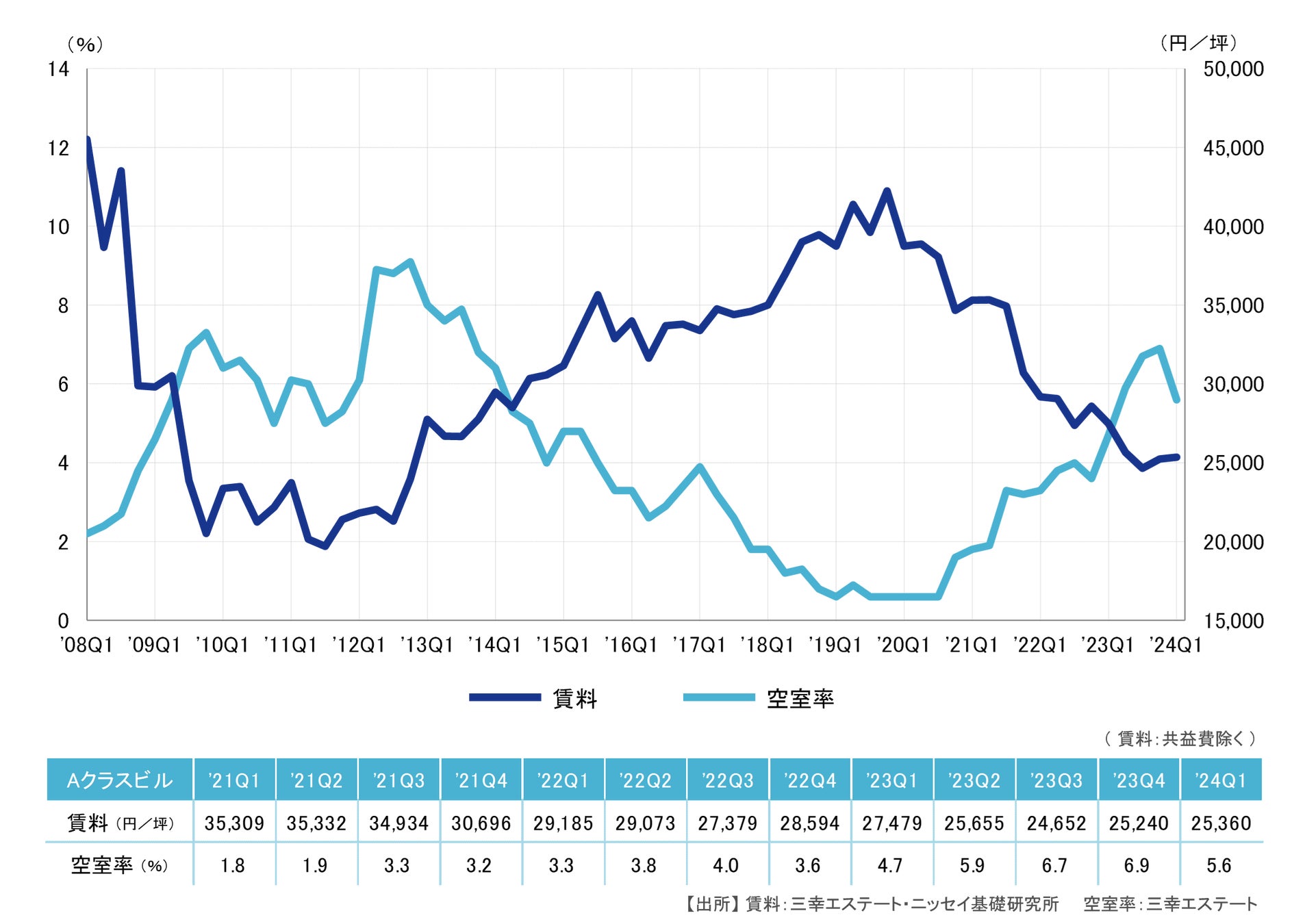 2024年第1四半期のAクラスビル賃料(成約賃料ベース)は前期比プラス120円/坪の25,360円/坪(共益費除く)となった。2期連続で小幅に上昇し、賃料の低下傾向には下げ止まりの兆しが出始めている。
