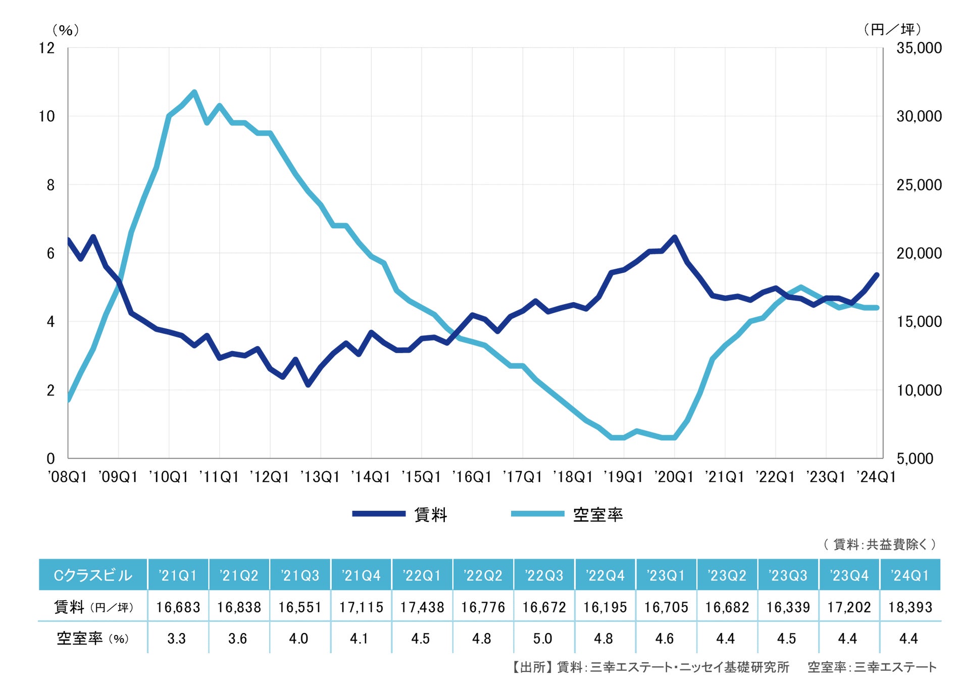 2024年第1四半期のCクラスビル賃料は前期比プラス1,191円/坪の18,393円/坪(共益費除く)となった。2期連続で上昇し、2020年第3四半期以来の18,000円/坪台を回復した。賃料の横ばい傾向には変化の兆しが出始めている。