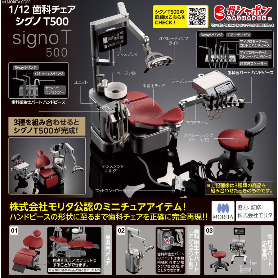 本商品は歯科チェア国内大手製造販売企業の株式会社モリタとの共同開発商品第2弾として、 全国の歯科医院で使用されている「シグノ T500」を患者用の椅子とその周りの機器も本物同様に 1/12 のサイズで再現したリアルフィギュアです。歯科チェア、歯科衛生士パート、歯科医パートの 3 つを集めると 歯科医院さながらの歯科チェアが完成します。