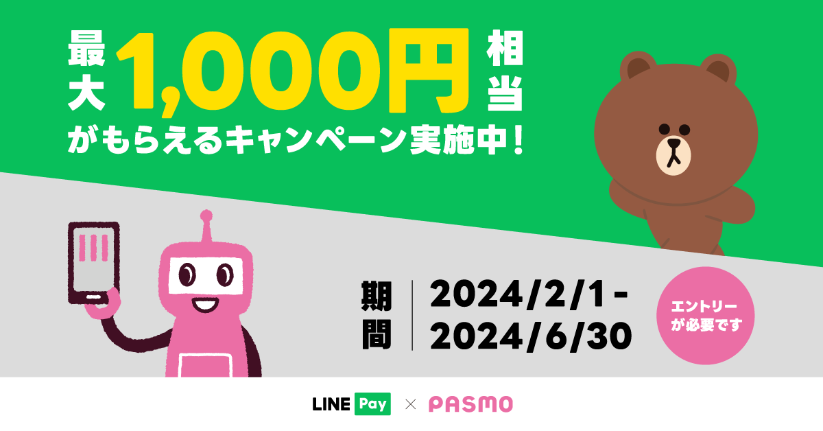 LINE Pay株式会社とPASMO協議会および株式会社パスモは、本日から2024年6月30日まで、Visa LINE Payプリペイドカード(以下、LINEプリペ(Visa))を使用したモバイルのPASMOでのチャージや定期券の購入により最大1,000円相当のLINE Pay残高がもらえるキャンペーンを開催します。