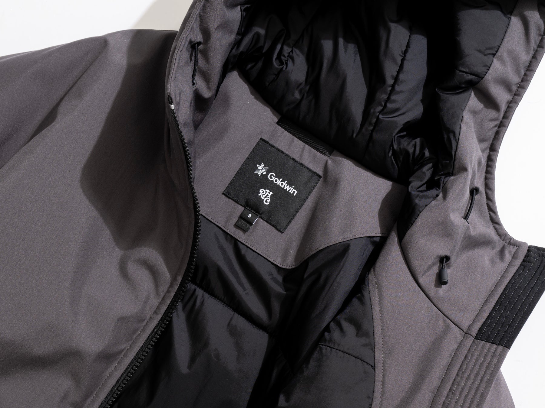 好評を博しているGoldwinとの別注企画より、シンプルな佇まいの中に多くの拘りが詰まったアウタージャケットが登場。今作の表地には、撥水性のあるウールを使用しており、落ち着いた光沢感が特徴。また、2層生地にしているため、防風性に優れているのも魅力です。裏地には、非常に軽くて柔らかい素材を配し、滑りが良く、快適な着心地を実現しております。中綿には、保温性の高い海洋プラスチックゴミを再生させた、環境に配慮した素材を使用しており、圧縮回復性が高いため、ロフト感を維持しやすく、長期間にわたって保温性を維持し続けることが出来ます。Goldwinがスキーウェアで培ってきた技術とRHCのエッセンスを融合させた大人の男性に相応しい1着です。