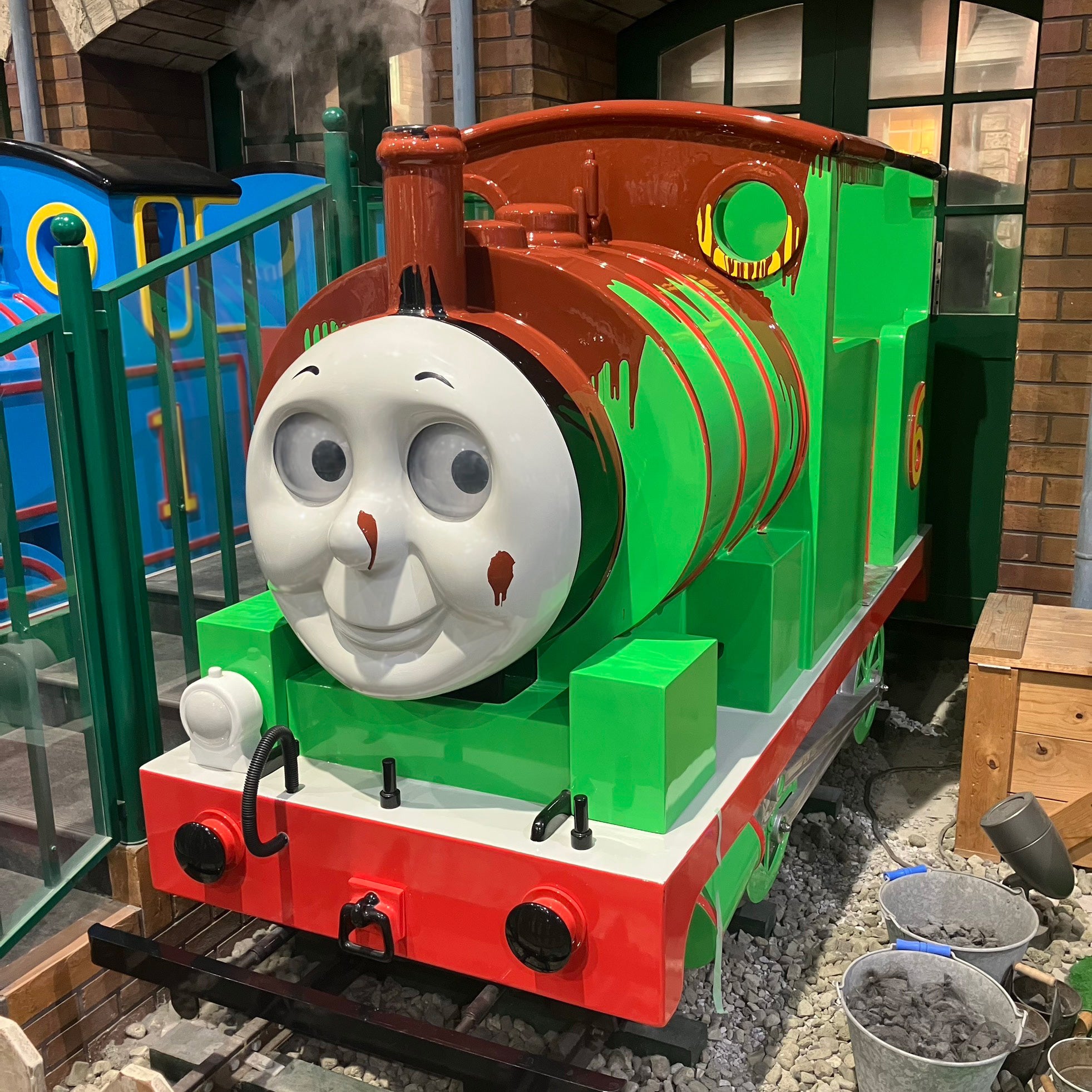 「トーマスタウン」の目玉アトラクション、「シアタートレイン」では、チョコレートまみれになったパーシーが登場!土日祝は、パーシーも走行します。