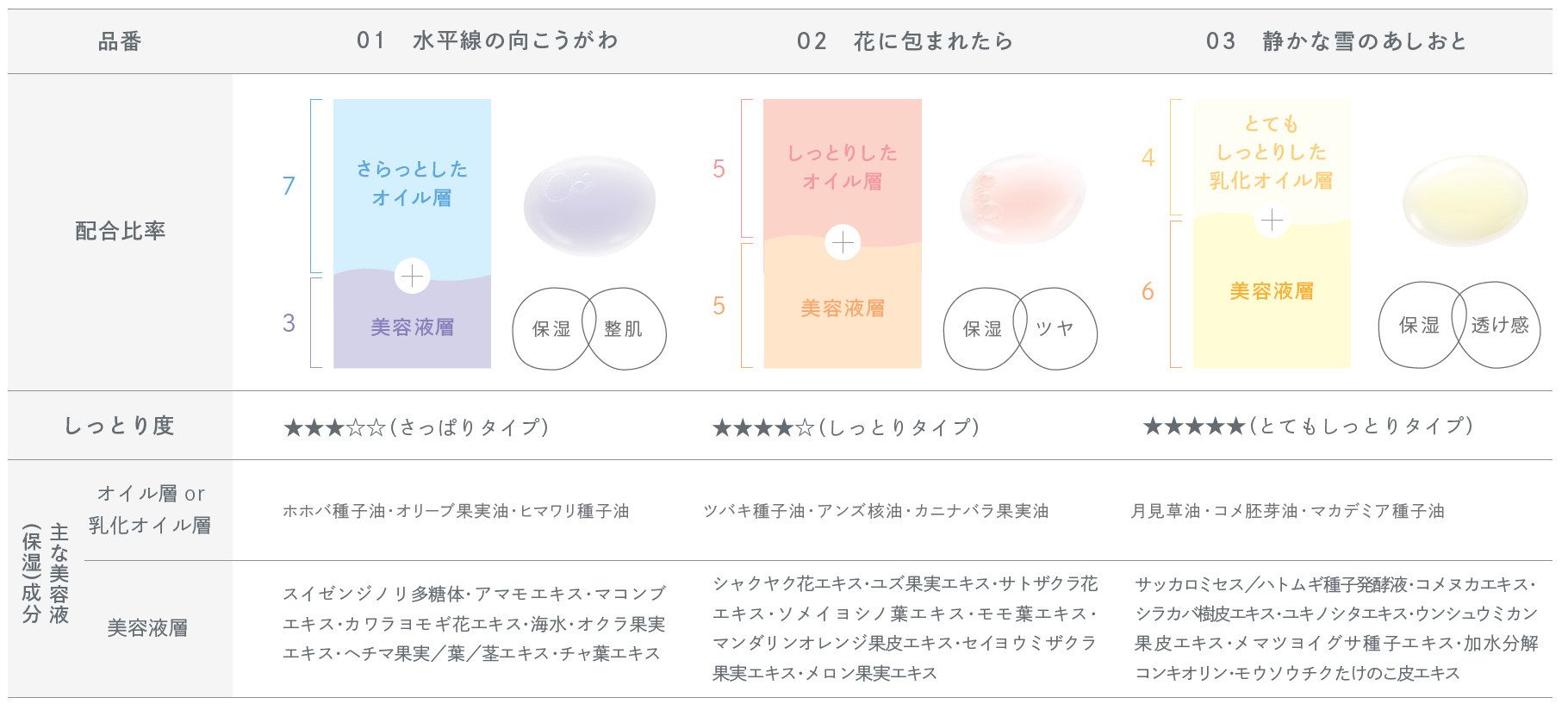 肌質や好みのテクスチャー、仕上がりで選んでいただけるよう美容液とオイル層の配合比率を最適なバランスで調合しました。